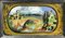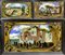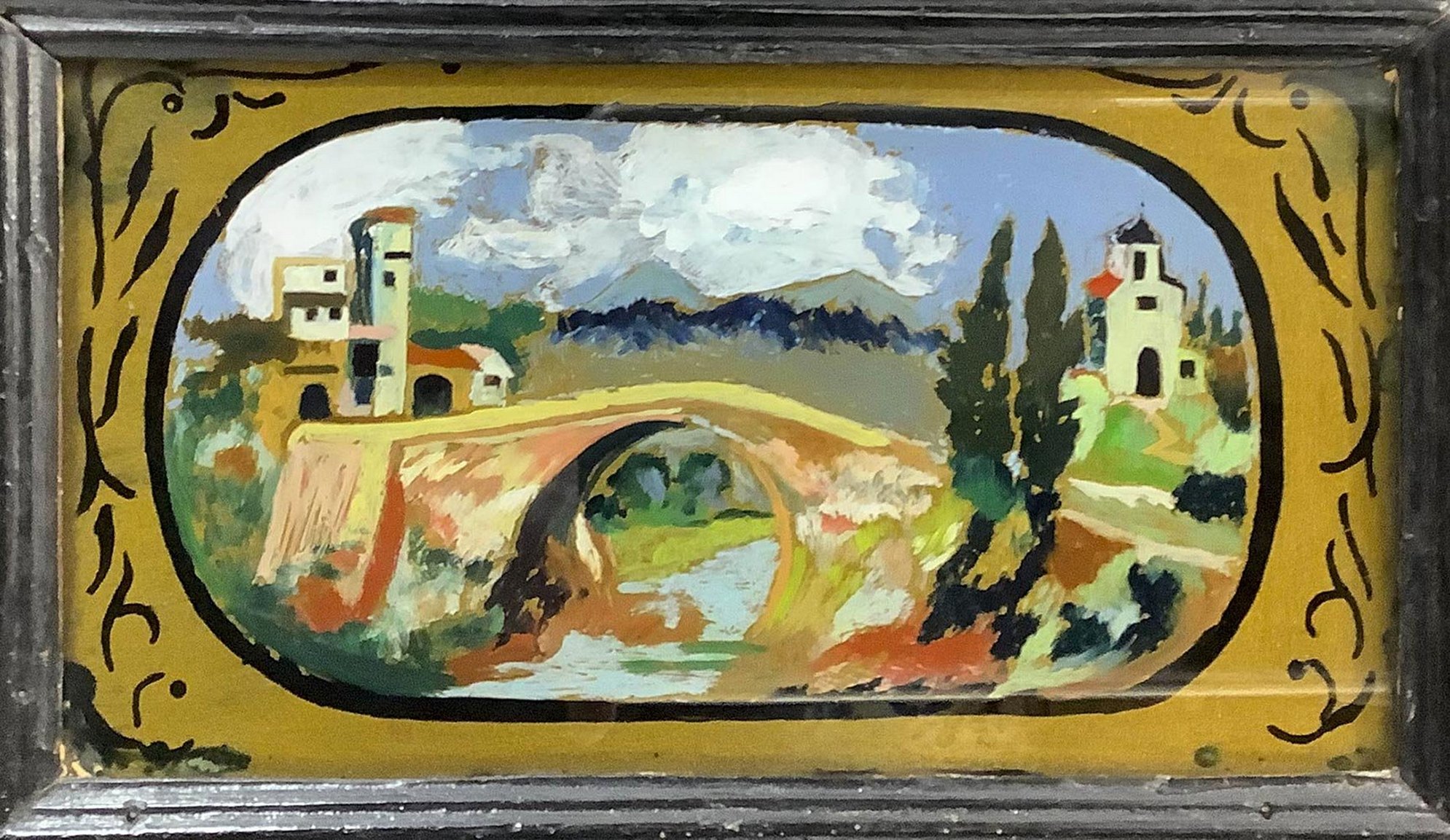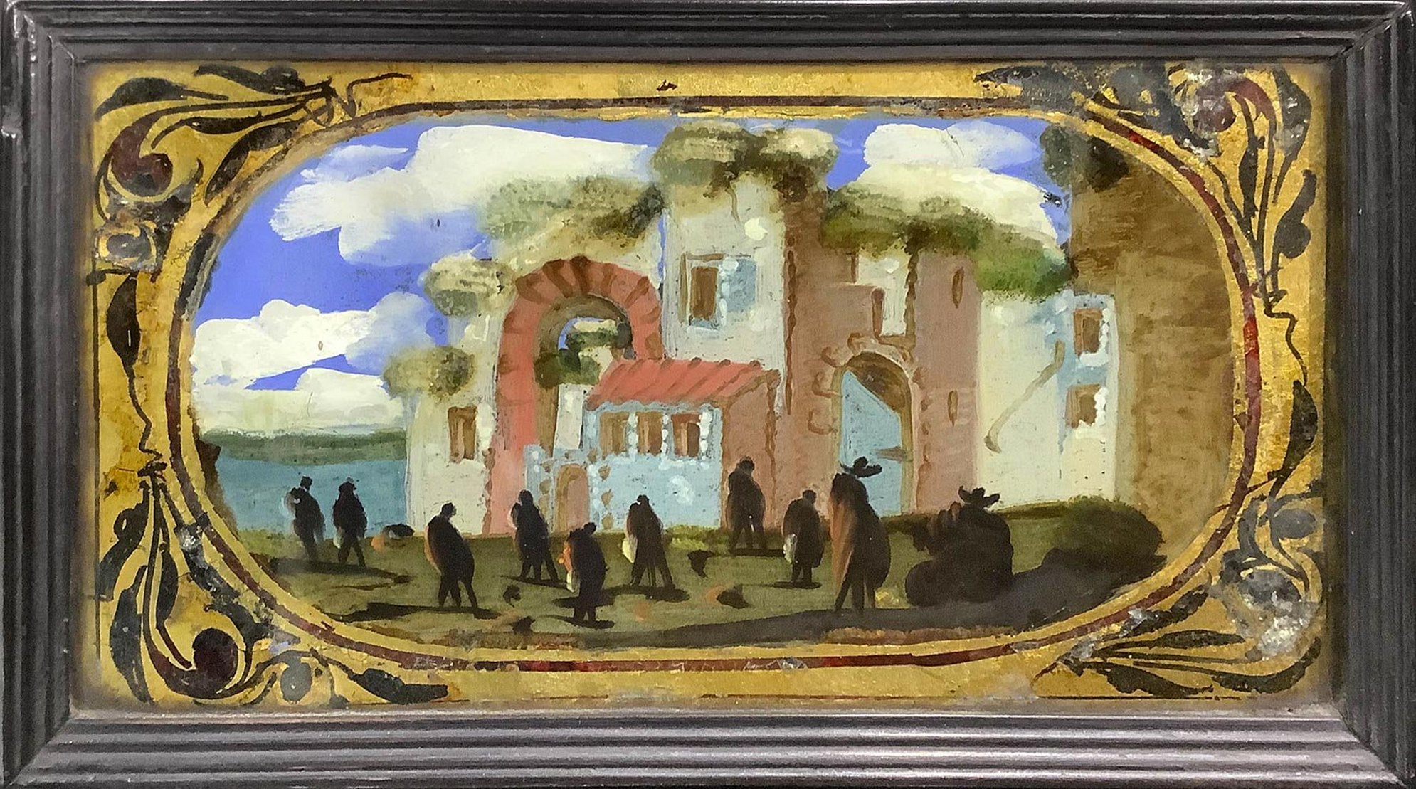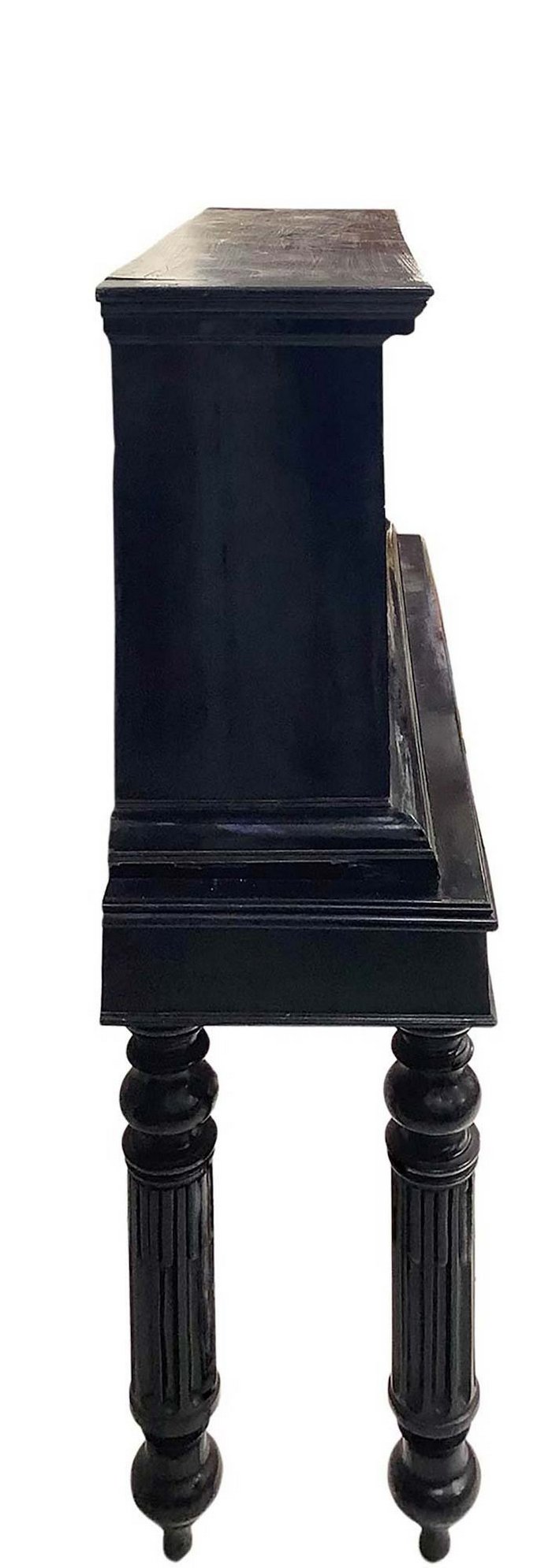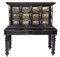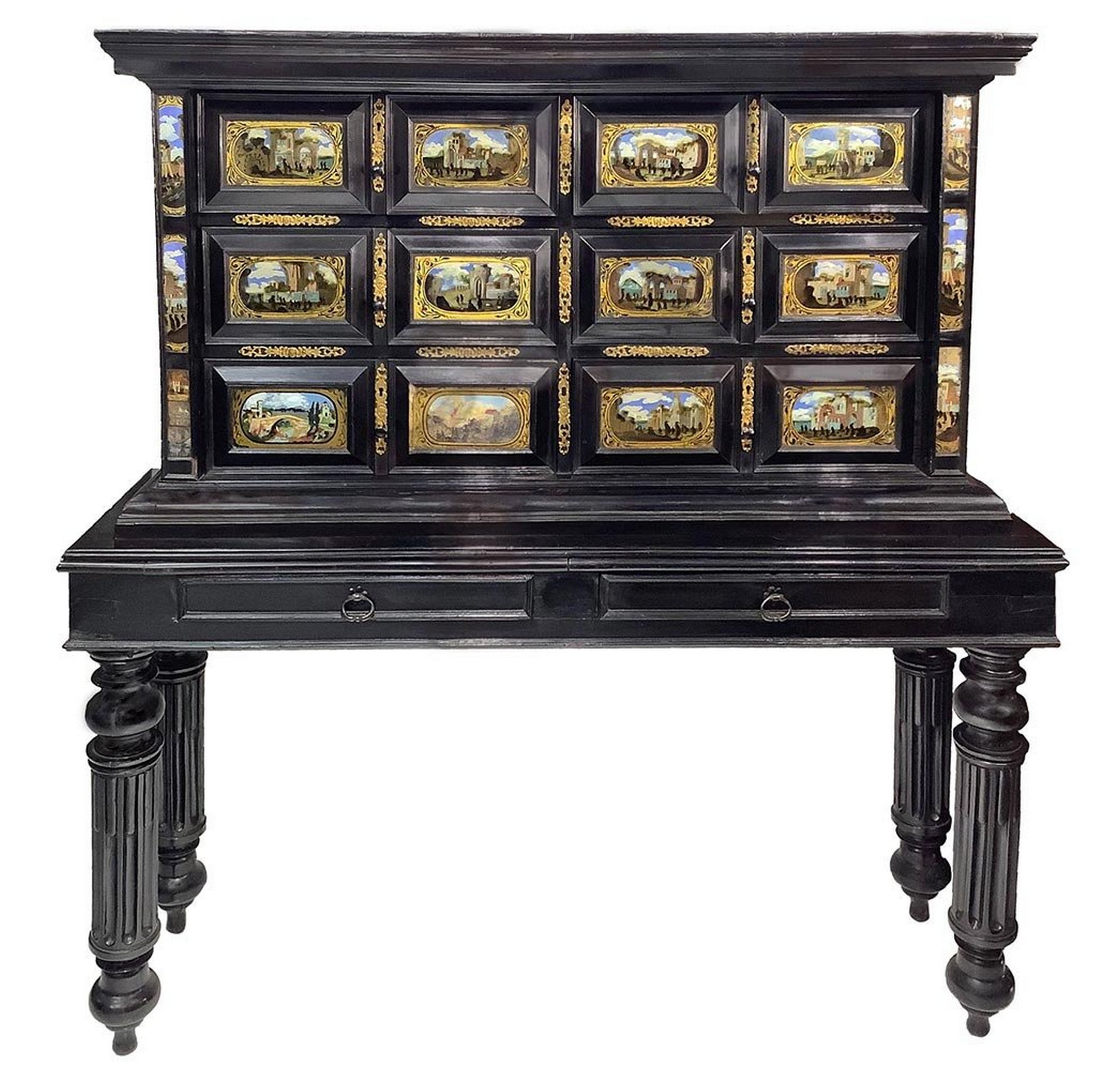 Monetiere in legno nero ebanizzato a due corpi, XVIII secolo. 12 formelle ai cassetti con pitture su vetro raffiguranti paesaggi con architetture. Avente come base tavolo in legno ebanizzato. H Cm 162. Cm 150x45
