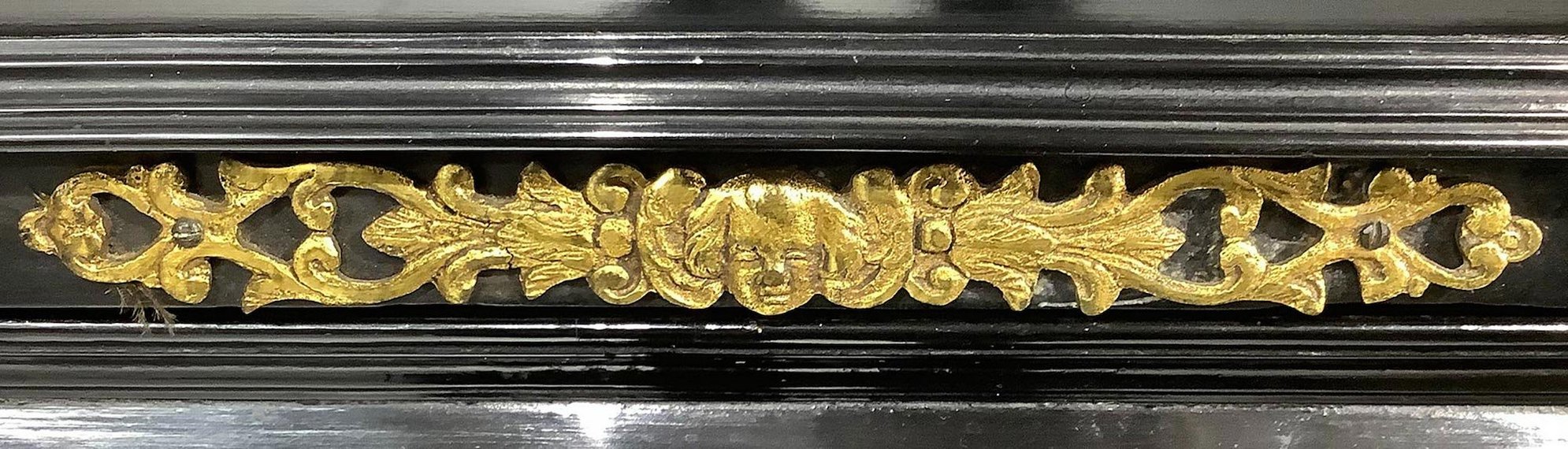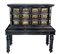 Monetiere in legno nero ebanizzato a due corpi, XVIII secolo. 12 formelle ai...