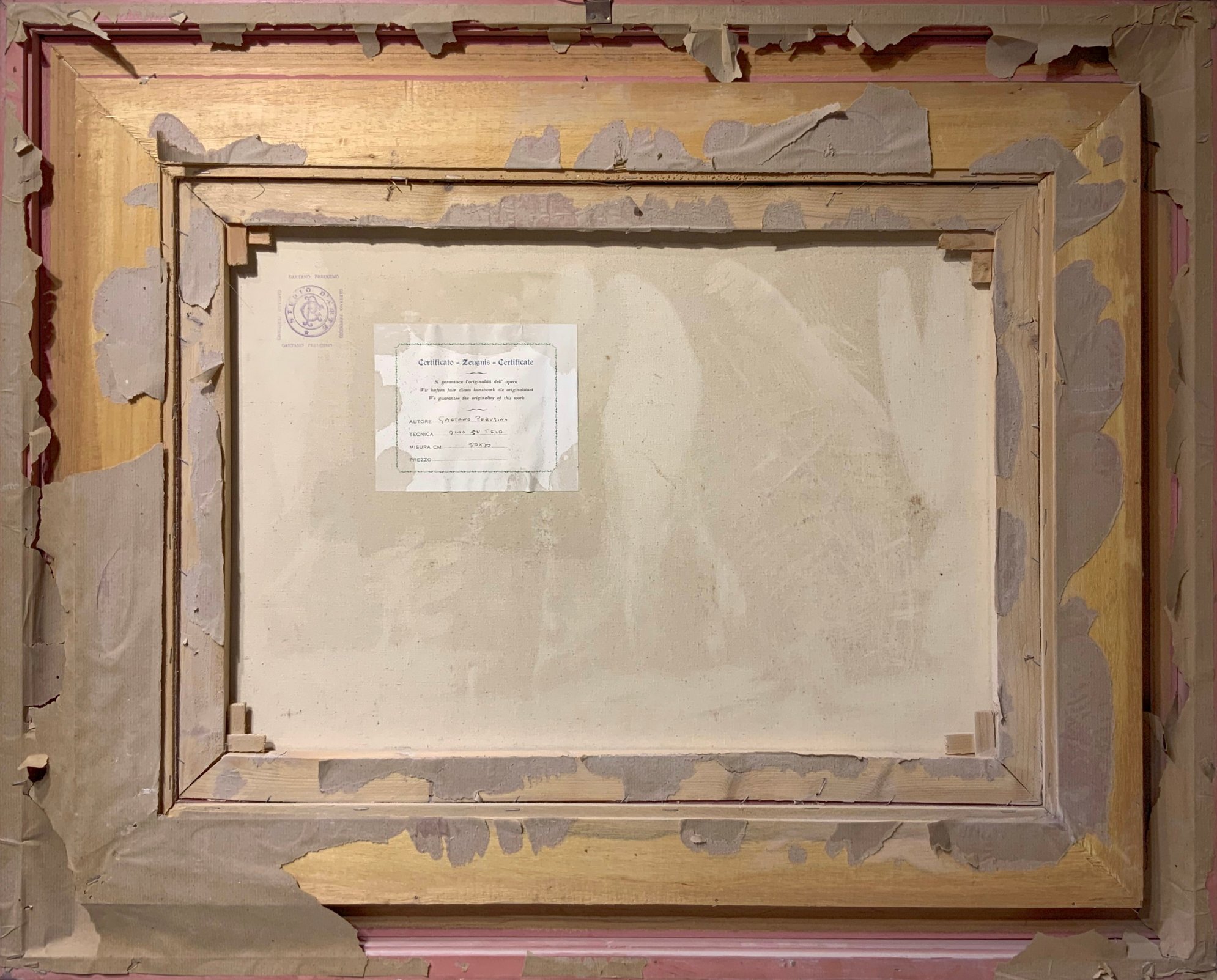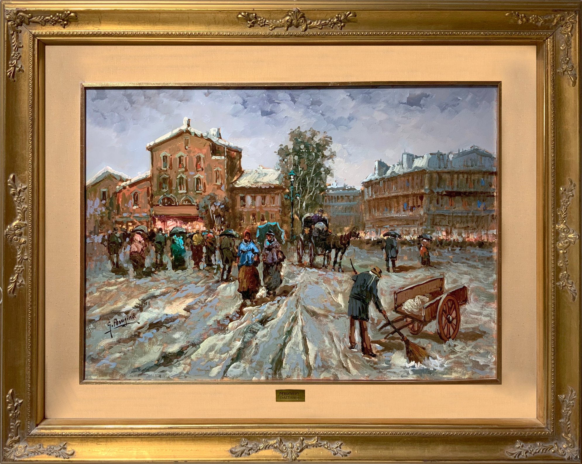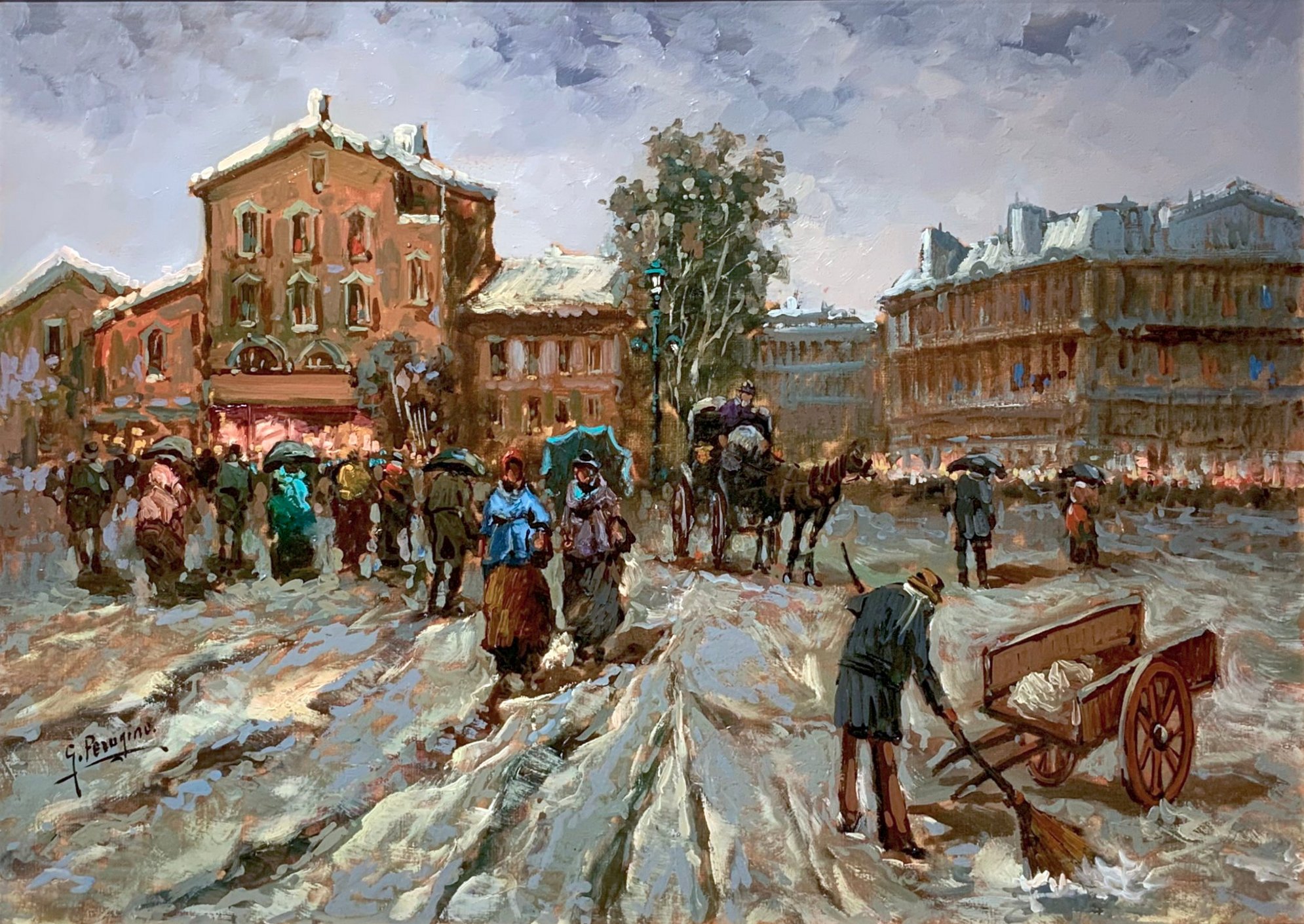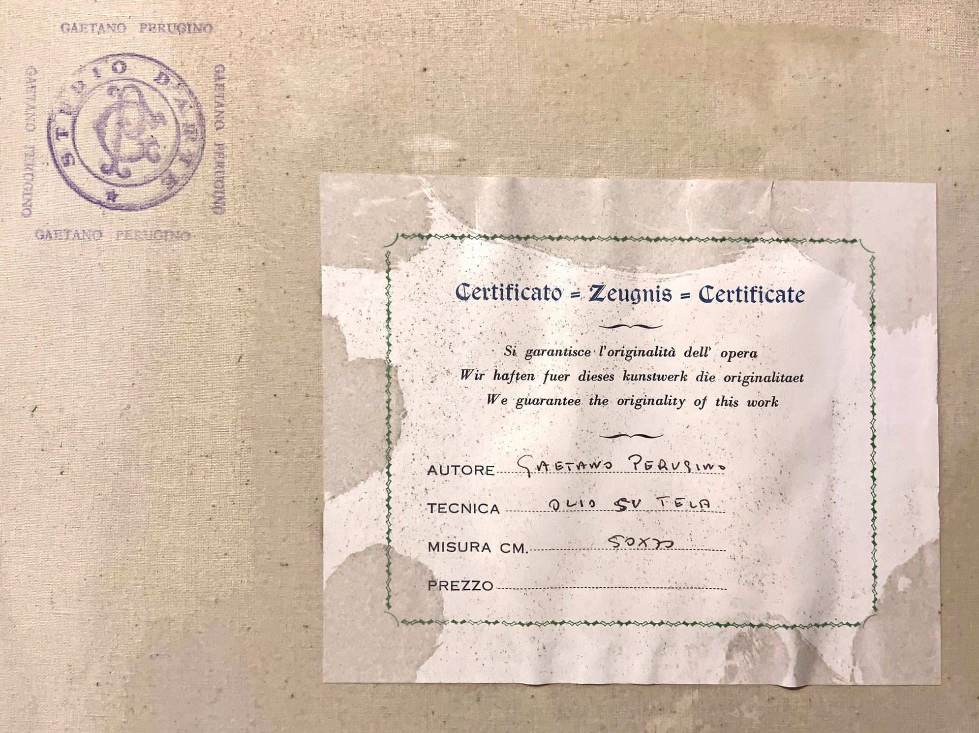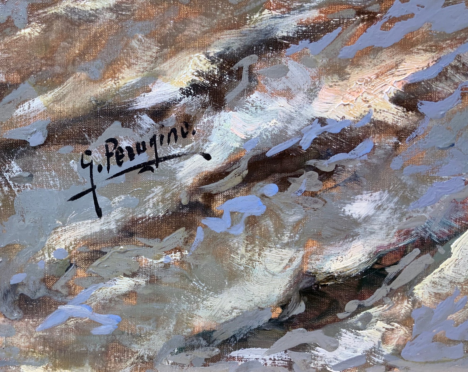 Dipinto ad olio su tela raffigurante strada di città con personaggi, XX secolo. Cm 50x70. Firmato in basso a sinistra Gaetano Perugino.