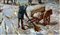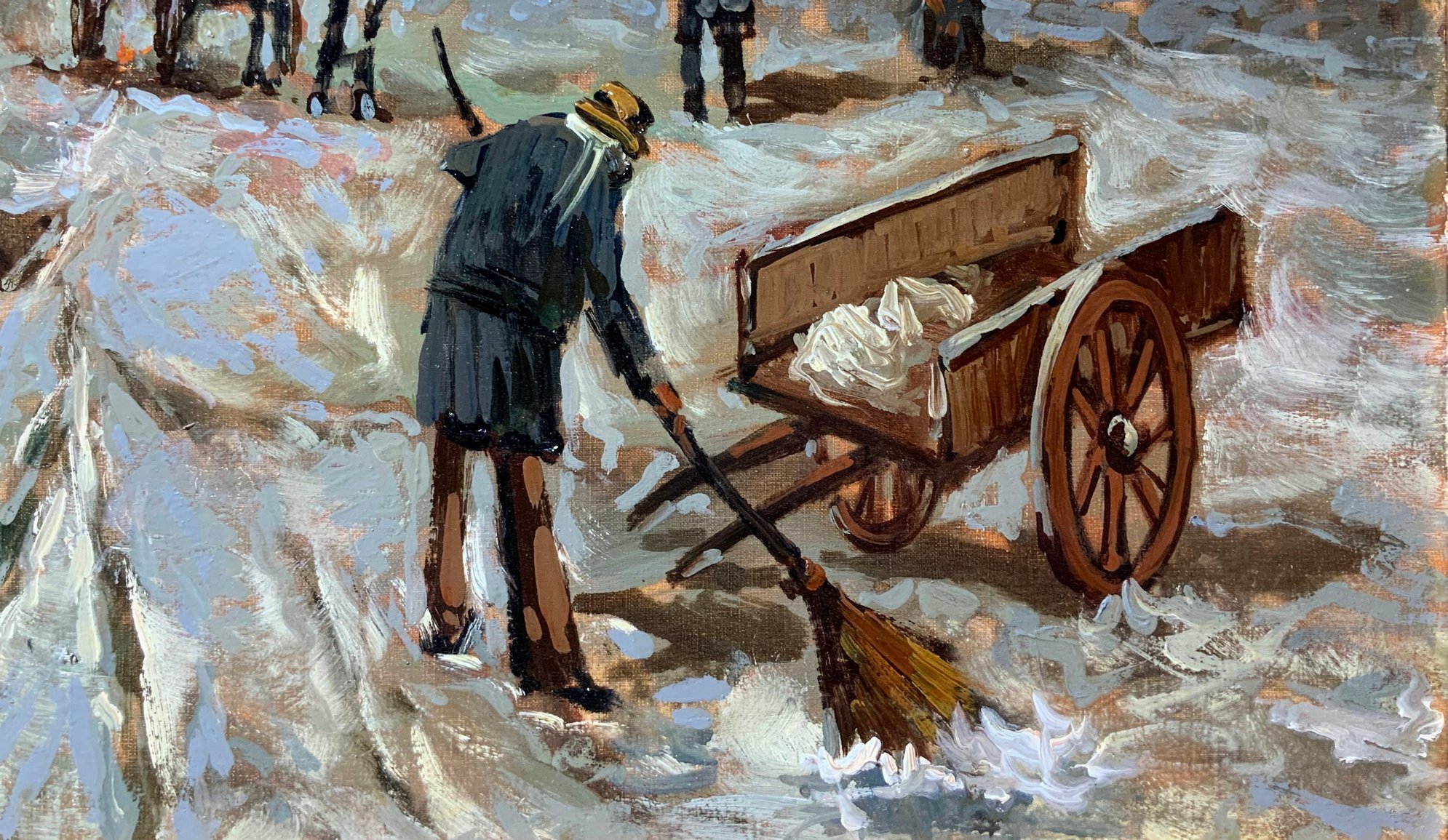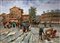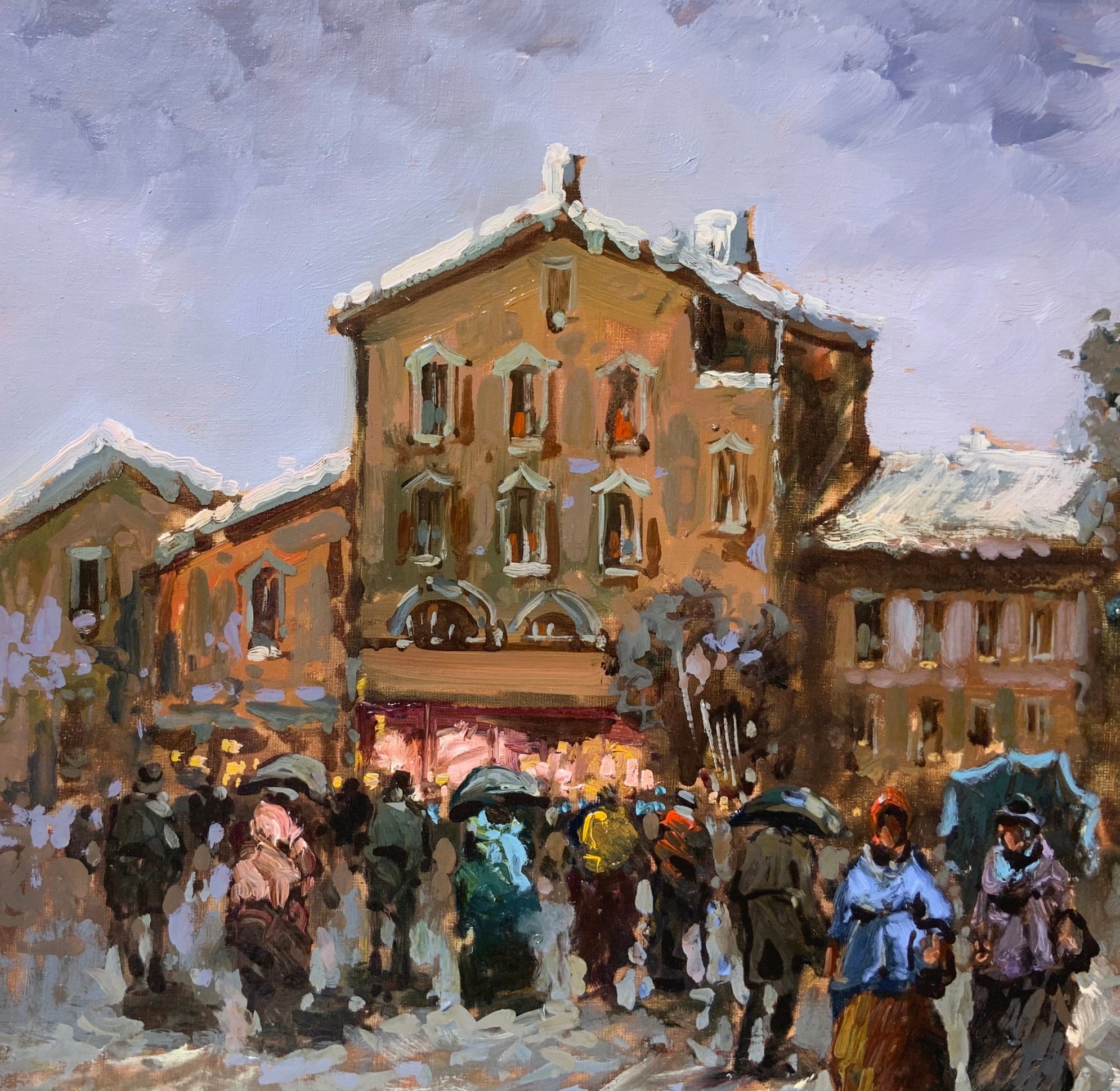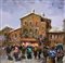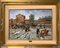 Dipinto ad olio su tela raffigurante strada di città con personaggi, XX...