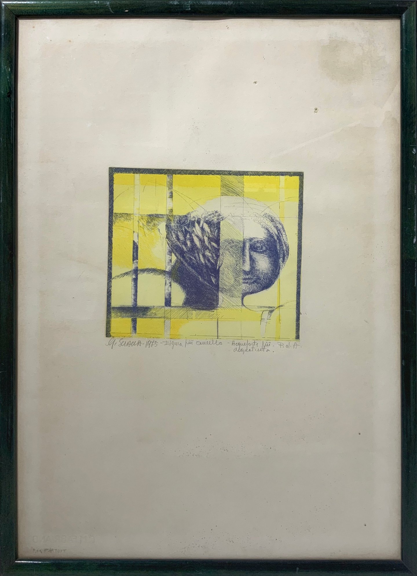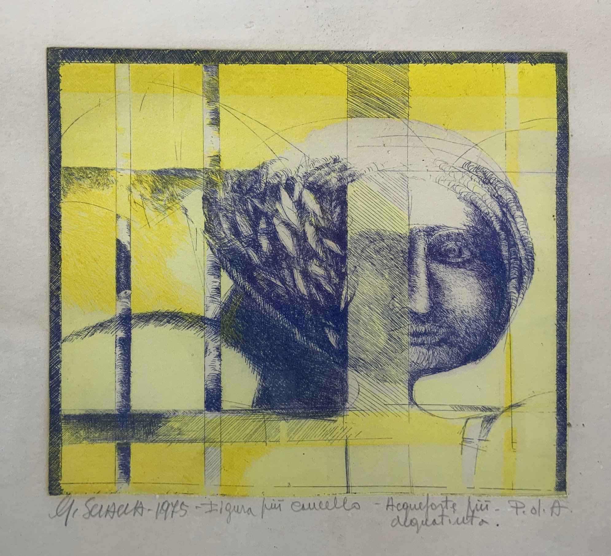 Incisione ad acquaforte più acquatinta raffigurante “figura più cancello” 1975, Giuseppe Sciacca (S. Tecla, Catania,1940). Cm 70x50. Prova d’autore.