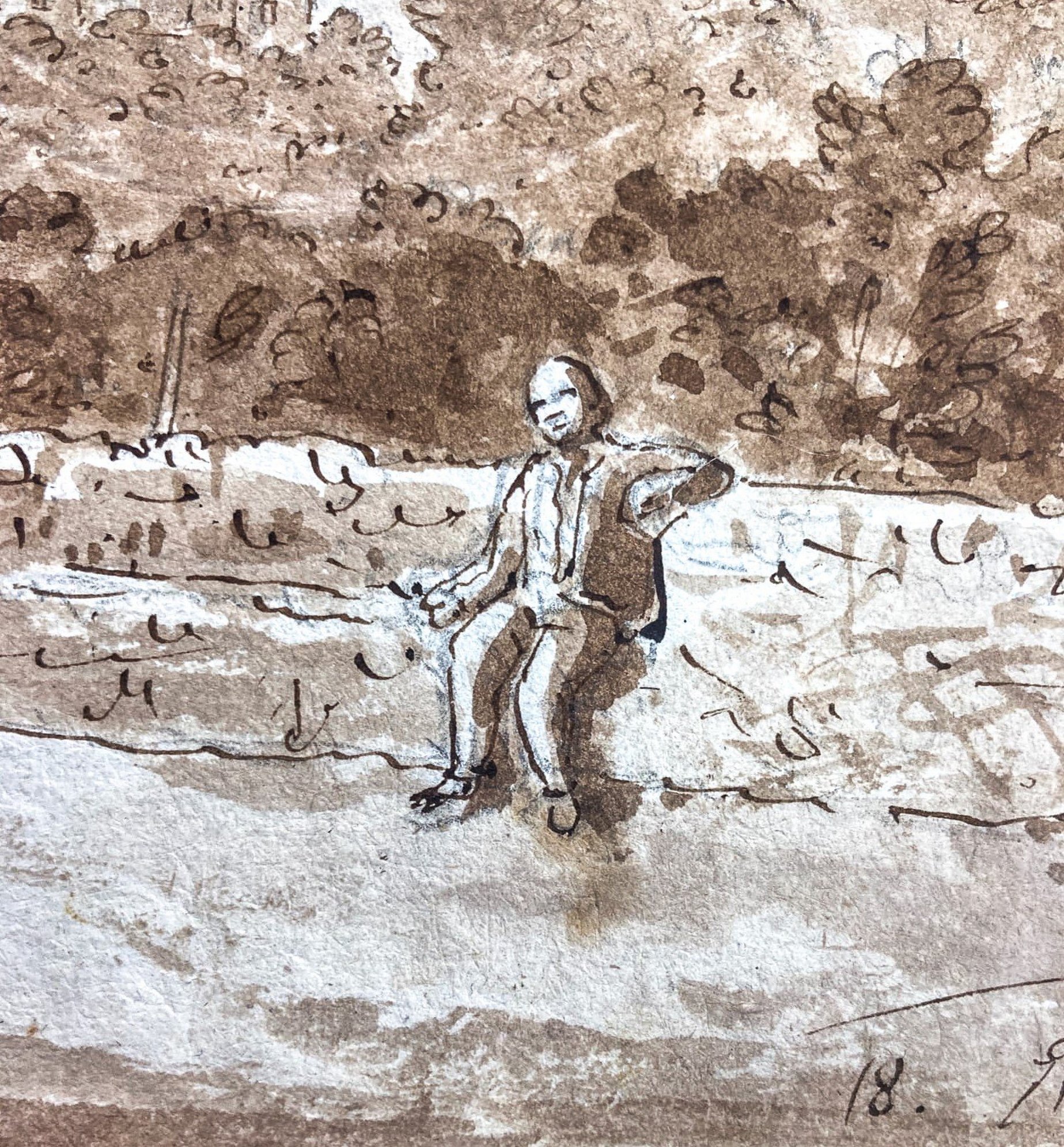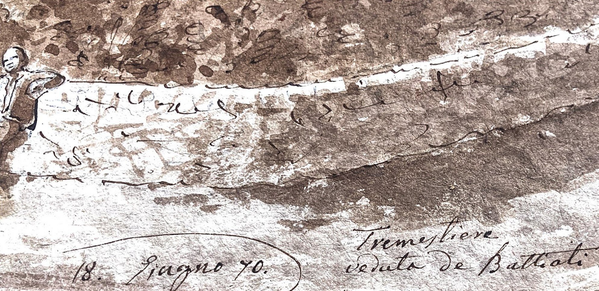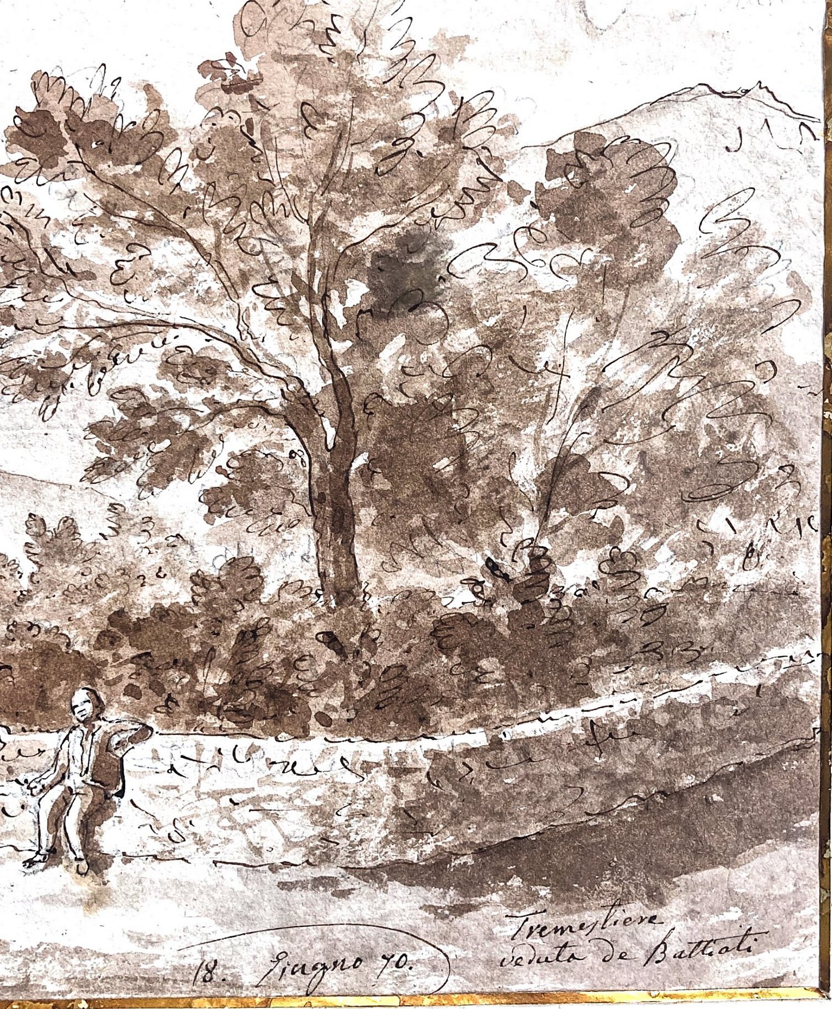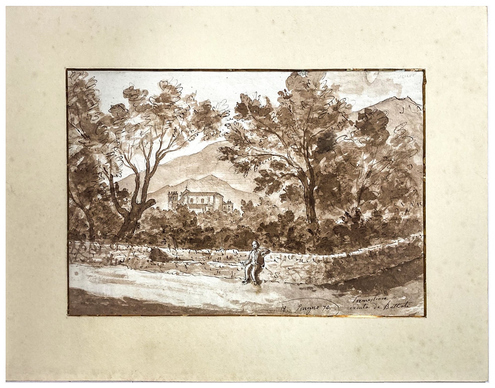 Disegno di autore anonimo raffigurante strada di campagna con personaggio, sullo sfondo chiesa di Raganosa ed Etna (Tremestieri, veduta da Battiati), XIX secolo. Acquerello su carta a inchiostro marrone. Mm 208x318. Datato in basso a destra 18 giugno '70.
