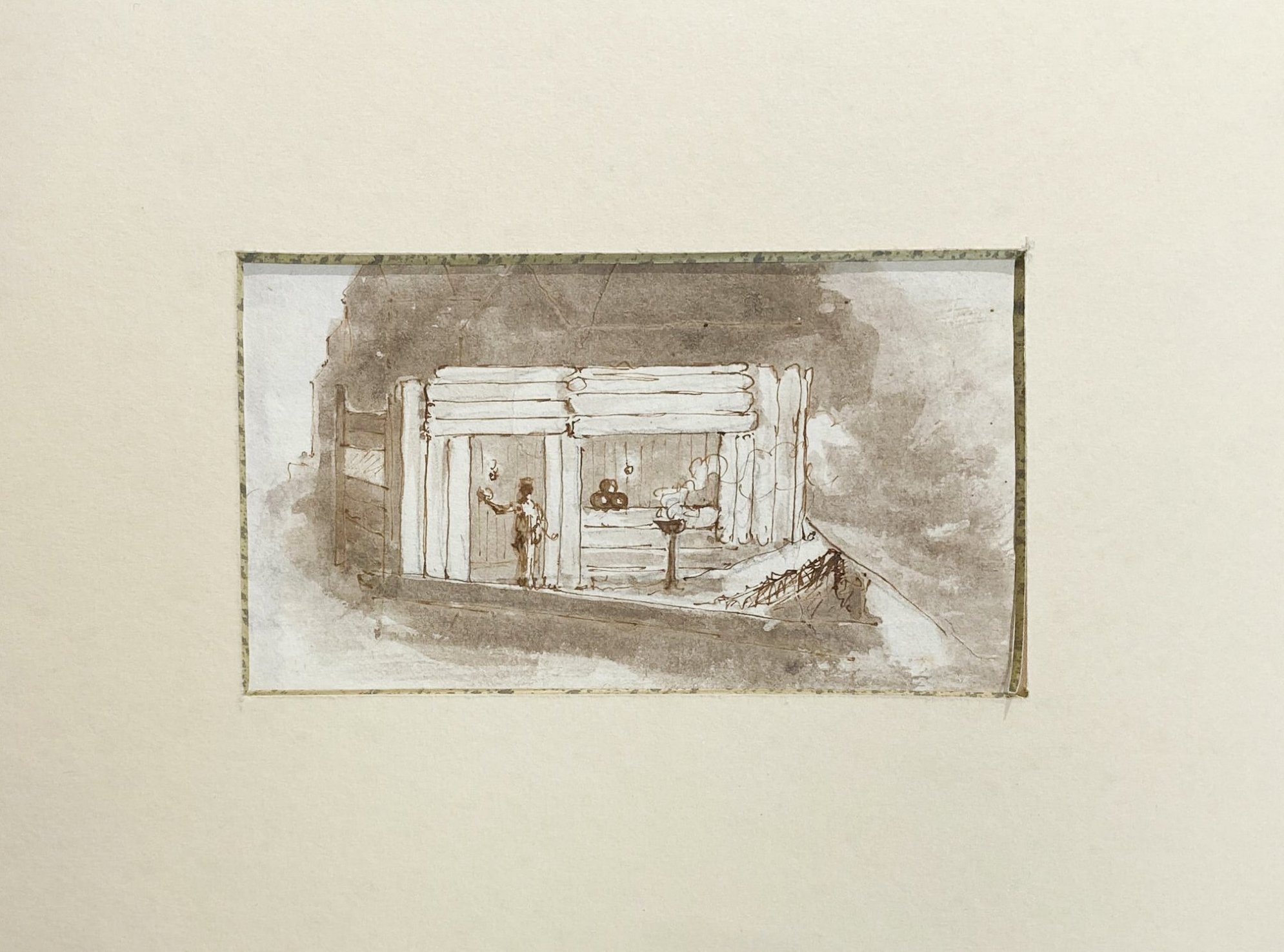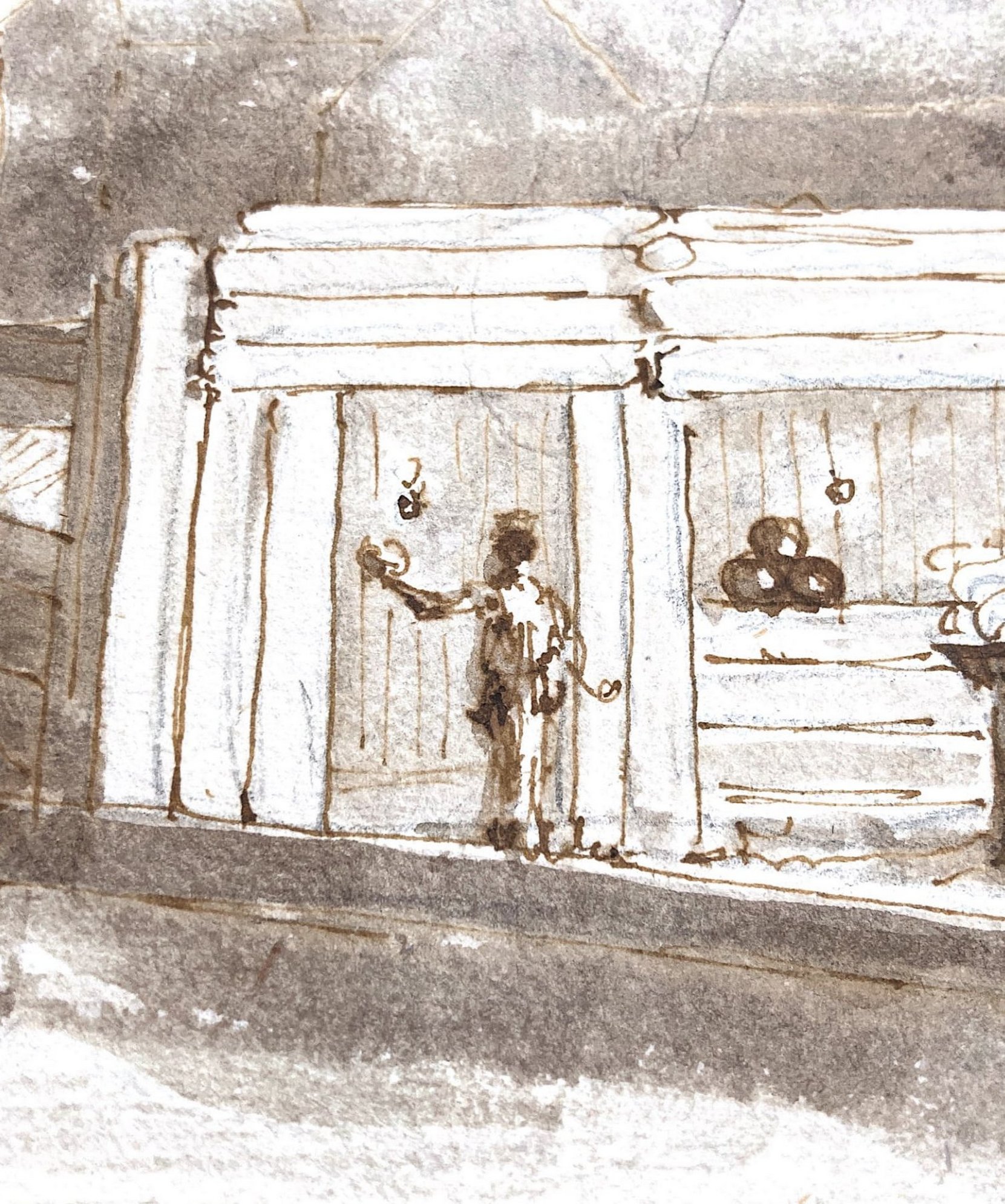 Disegno di autore anonimo raffigurante bottega per restauro barche del porto di Catania (Catania, Sicilia), XIX secolo. Acquerello su carta a inchiostro bruno. Mm 120x150. Testimonianza storico-locale.