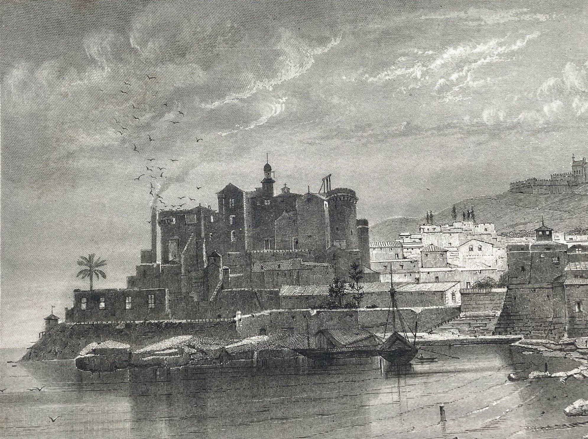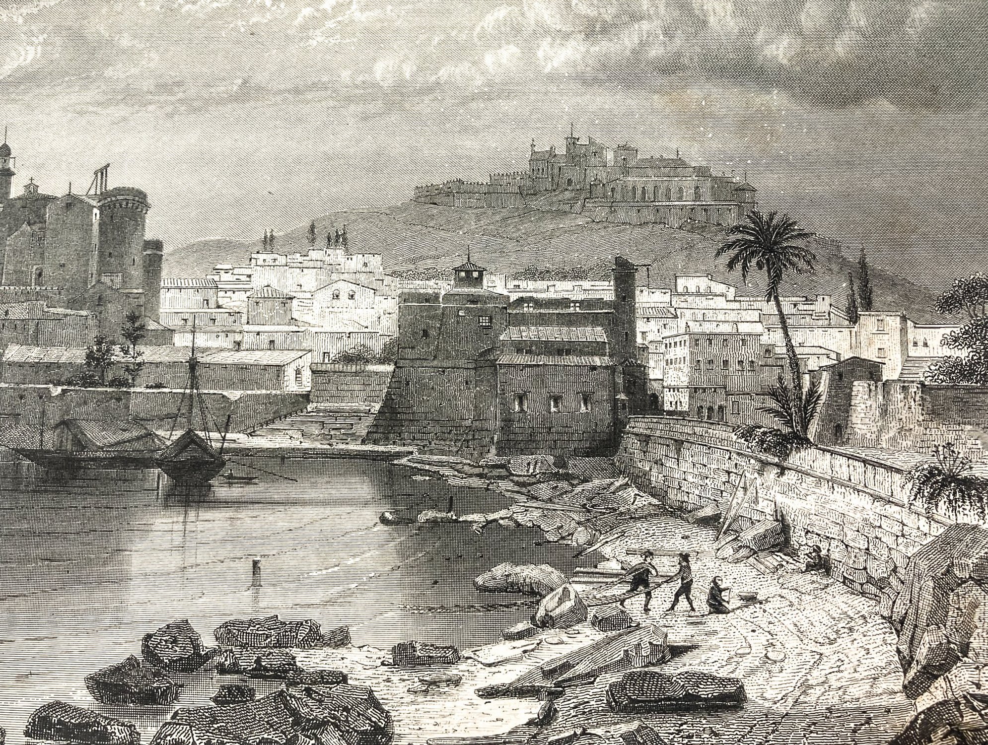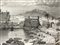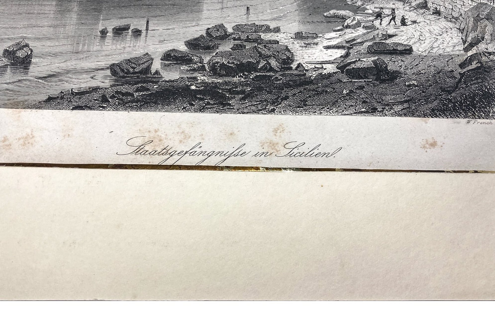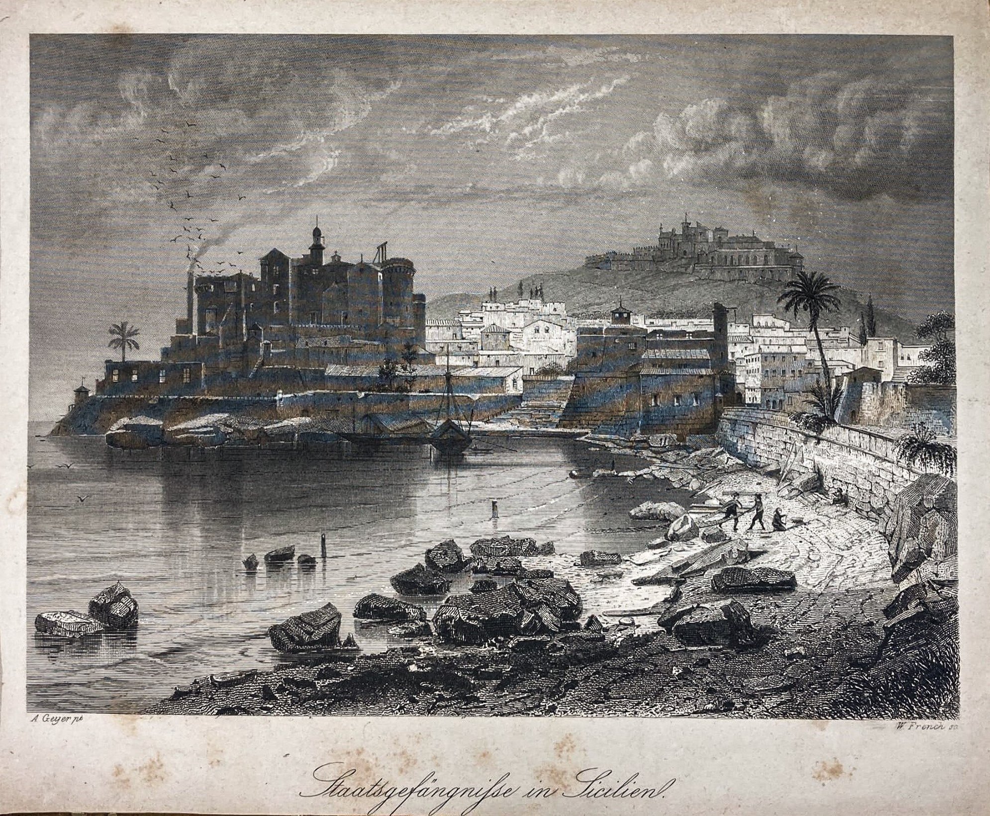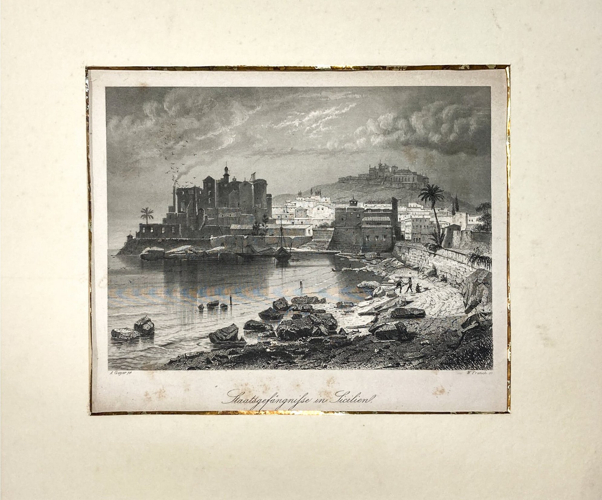 Incisione raffigurante carcere di stato con sullo sfondo Erice, XIX secolo, Sicilia. Mm 178x230. Incisore W.Frency, tratto dal libro Antiquariat heinz tessin 1845.
