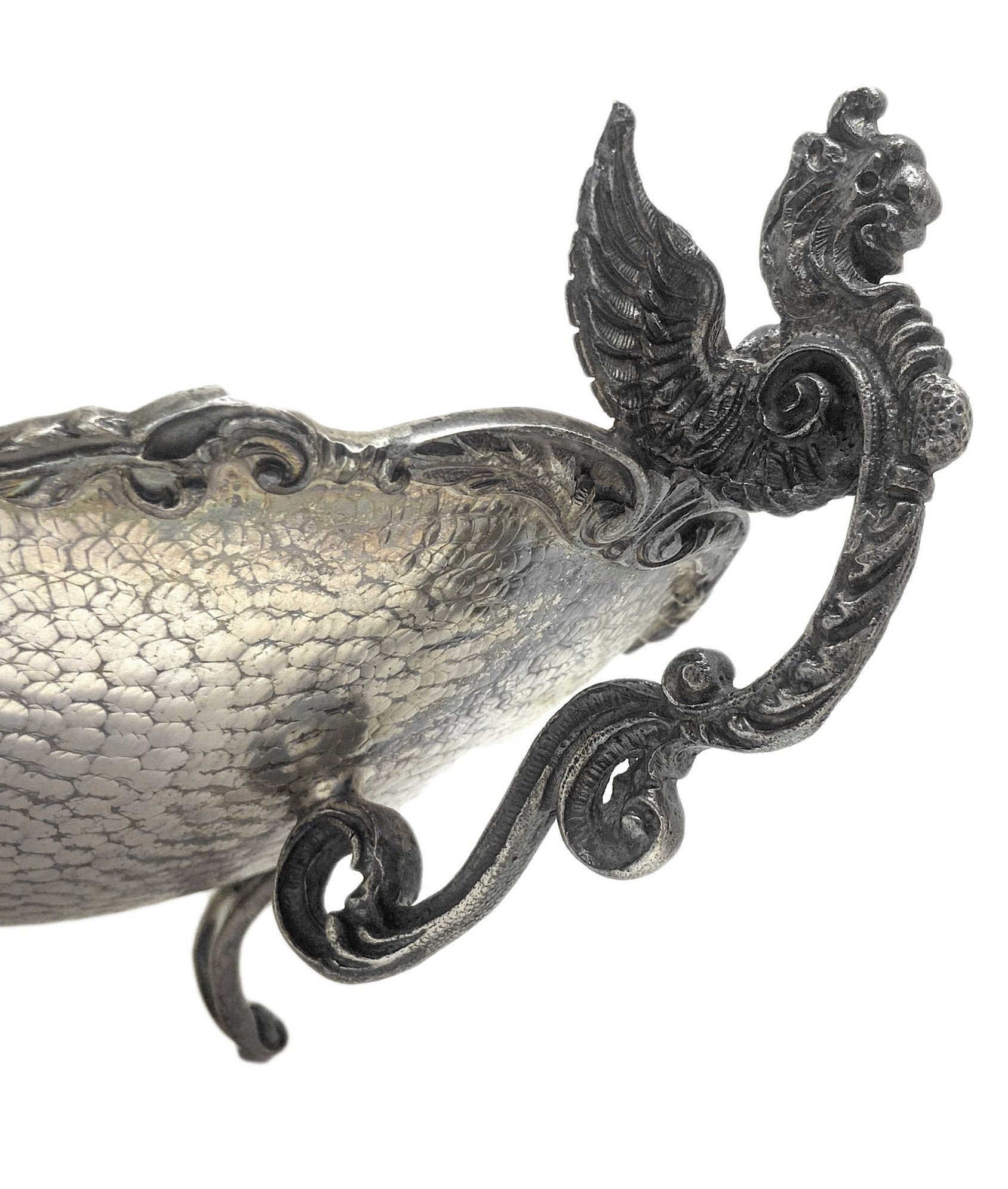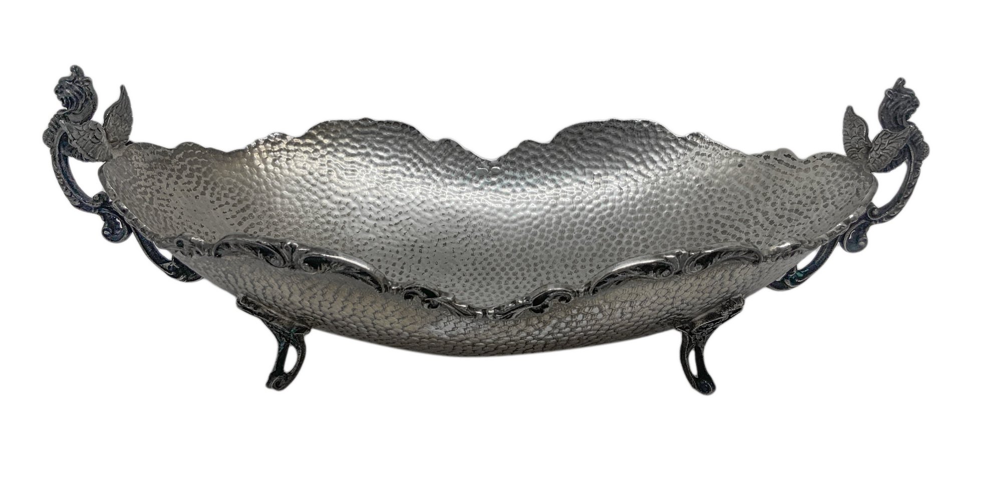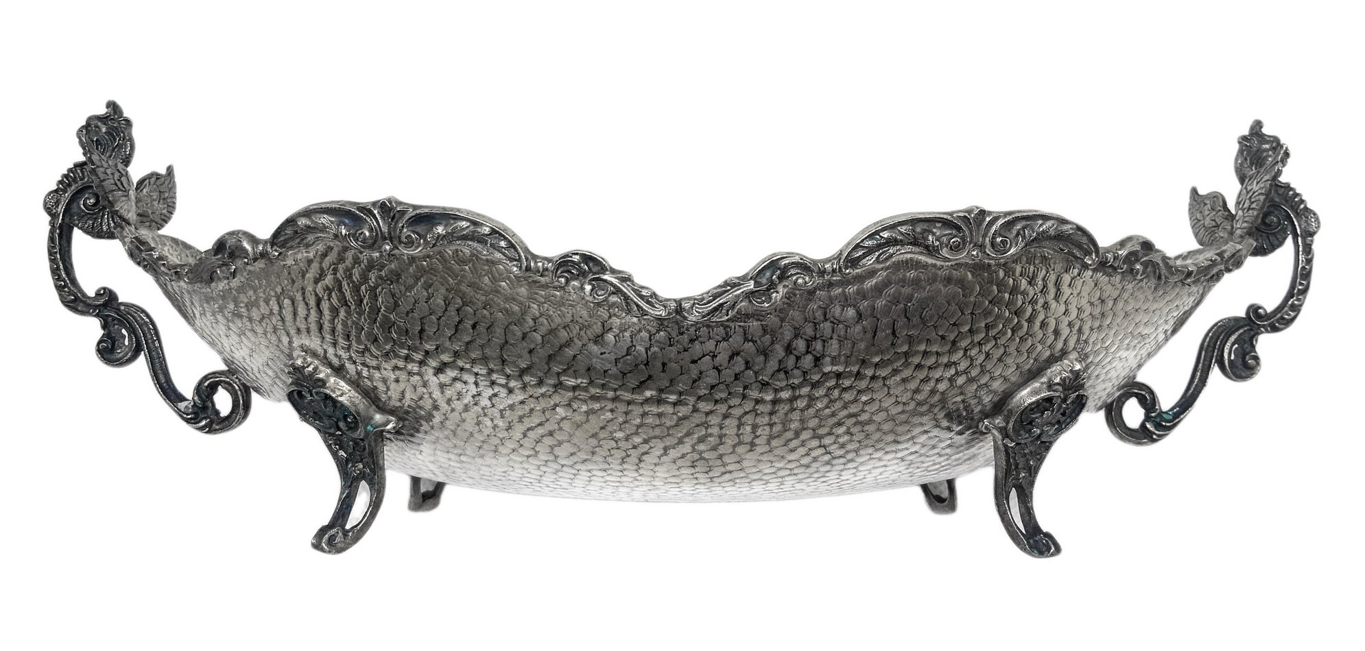 Centrotavola in argento 800 biansato con superfice martellata. H cm 9x26x13,5. Gr 300.