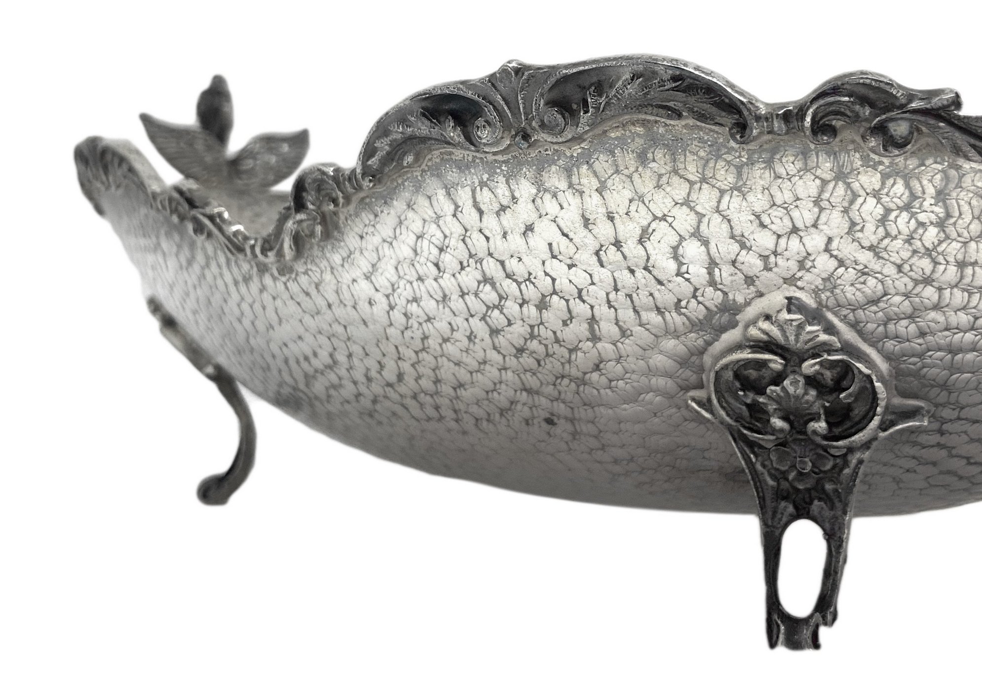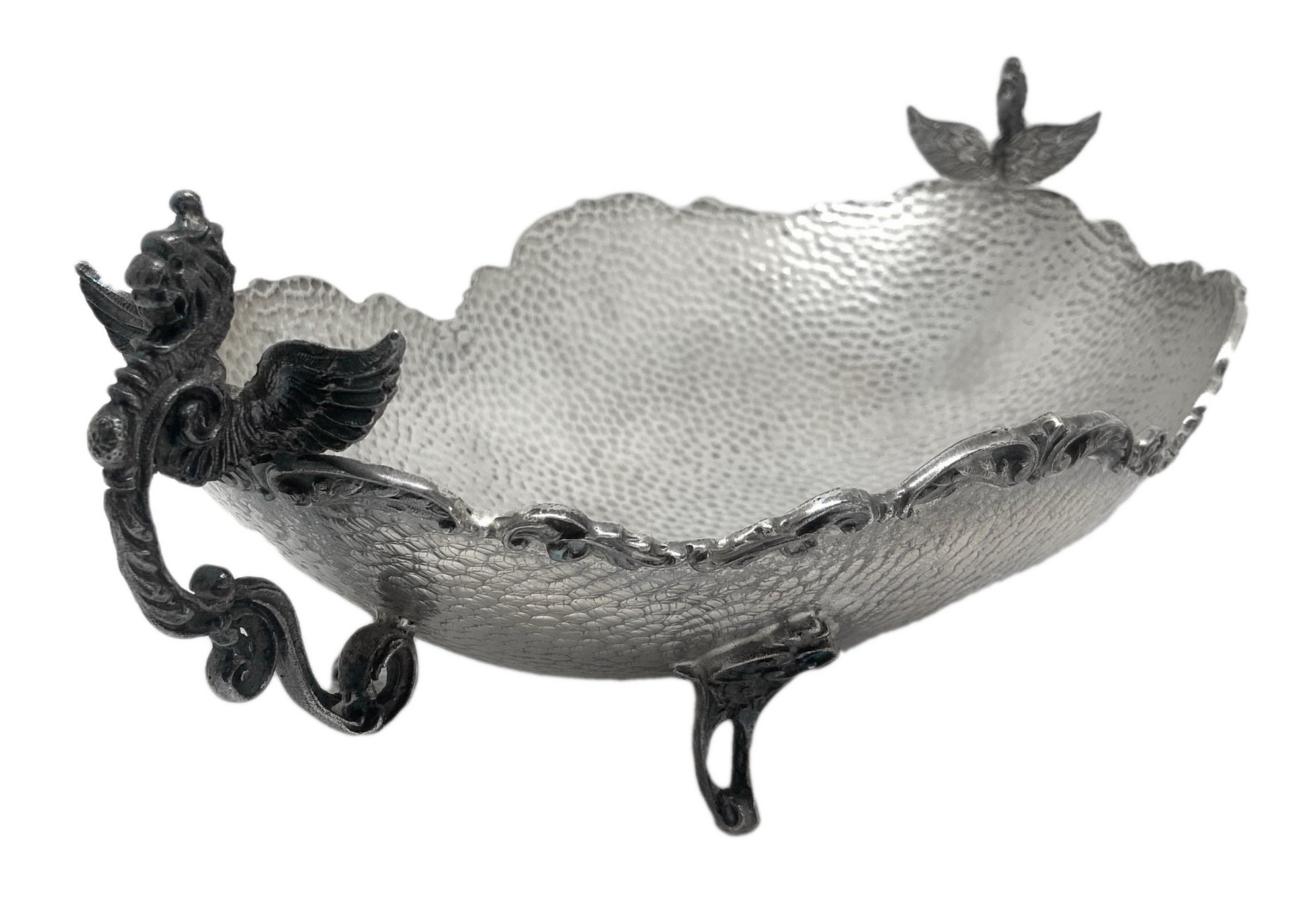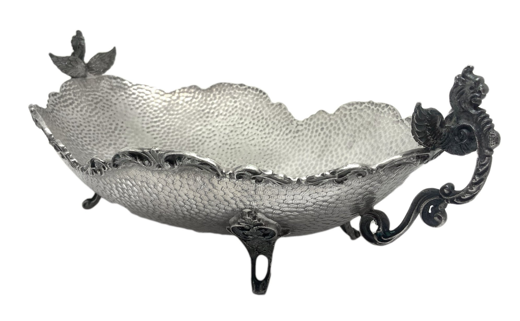 Centrotavola in argento 800 biansato con superfice martellata. H cm 9x26x13,5. Gr 300.