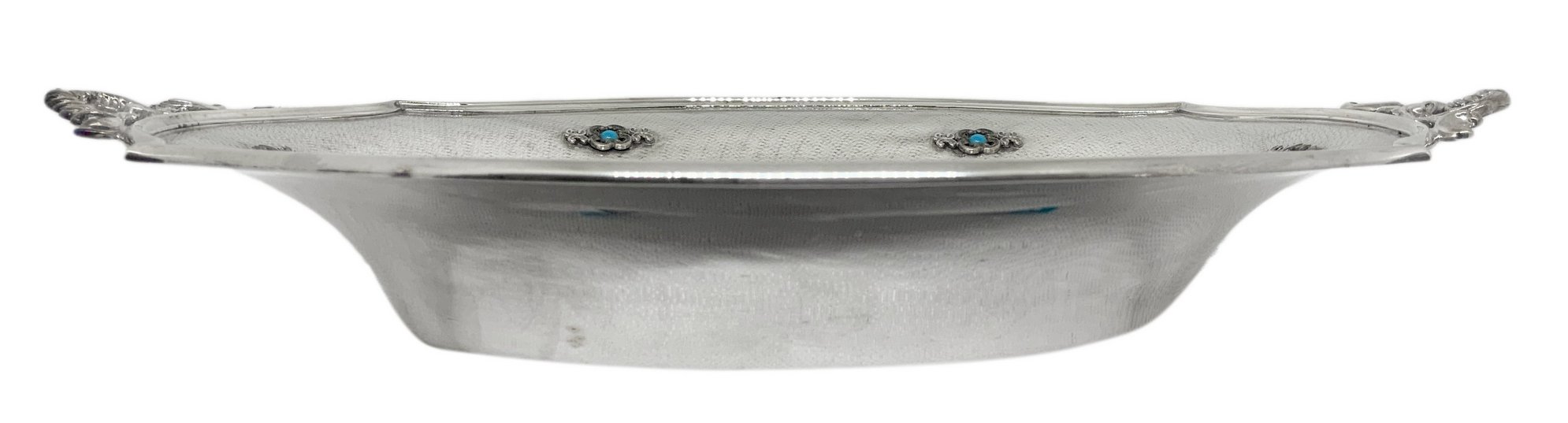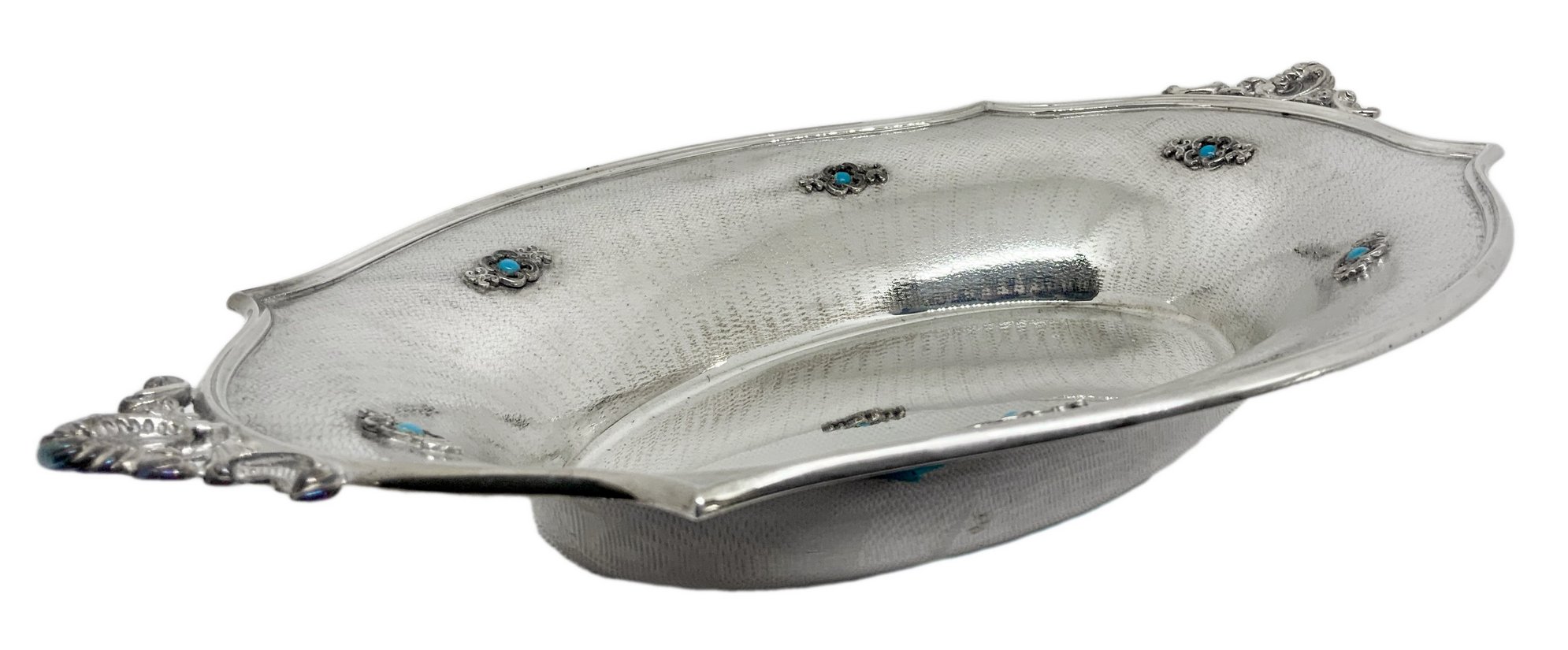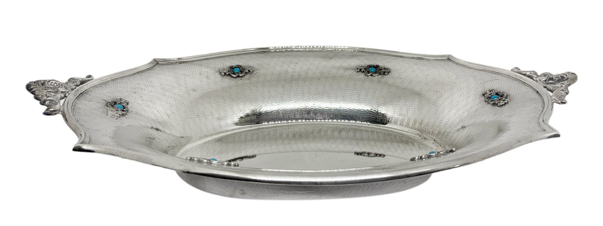Centrotavola in argento 800 con applicazioni di pietre dure colore turchese. Superfice della tesa finemente martellata. H cm 4x31x22. Peso gr 410.