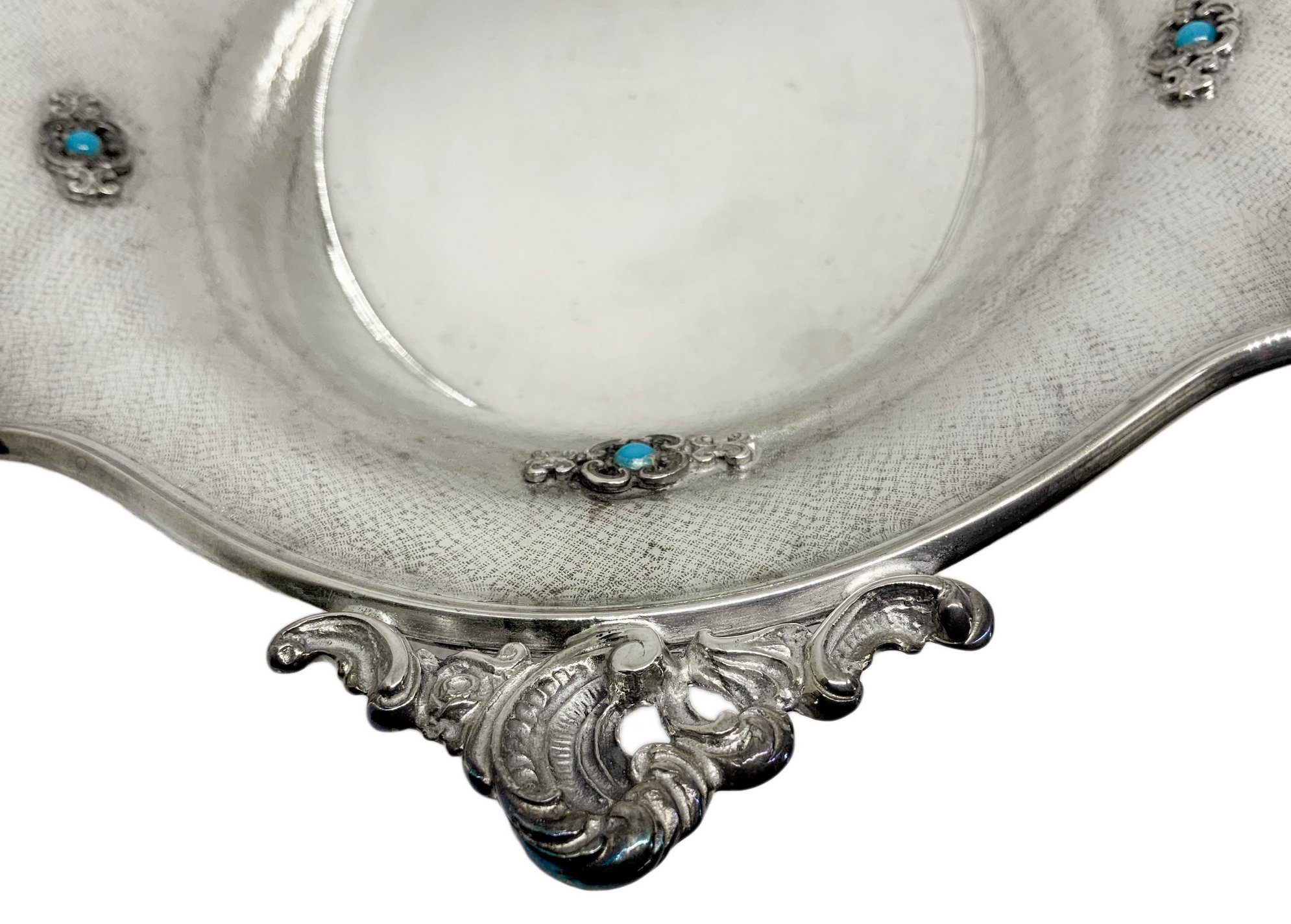 Centrotavola in argento 800 con applicazioni di pietre dure colore turchese....