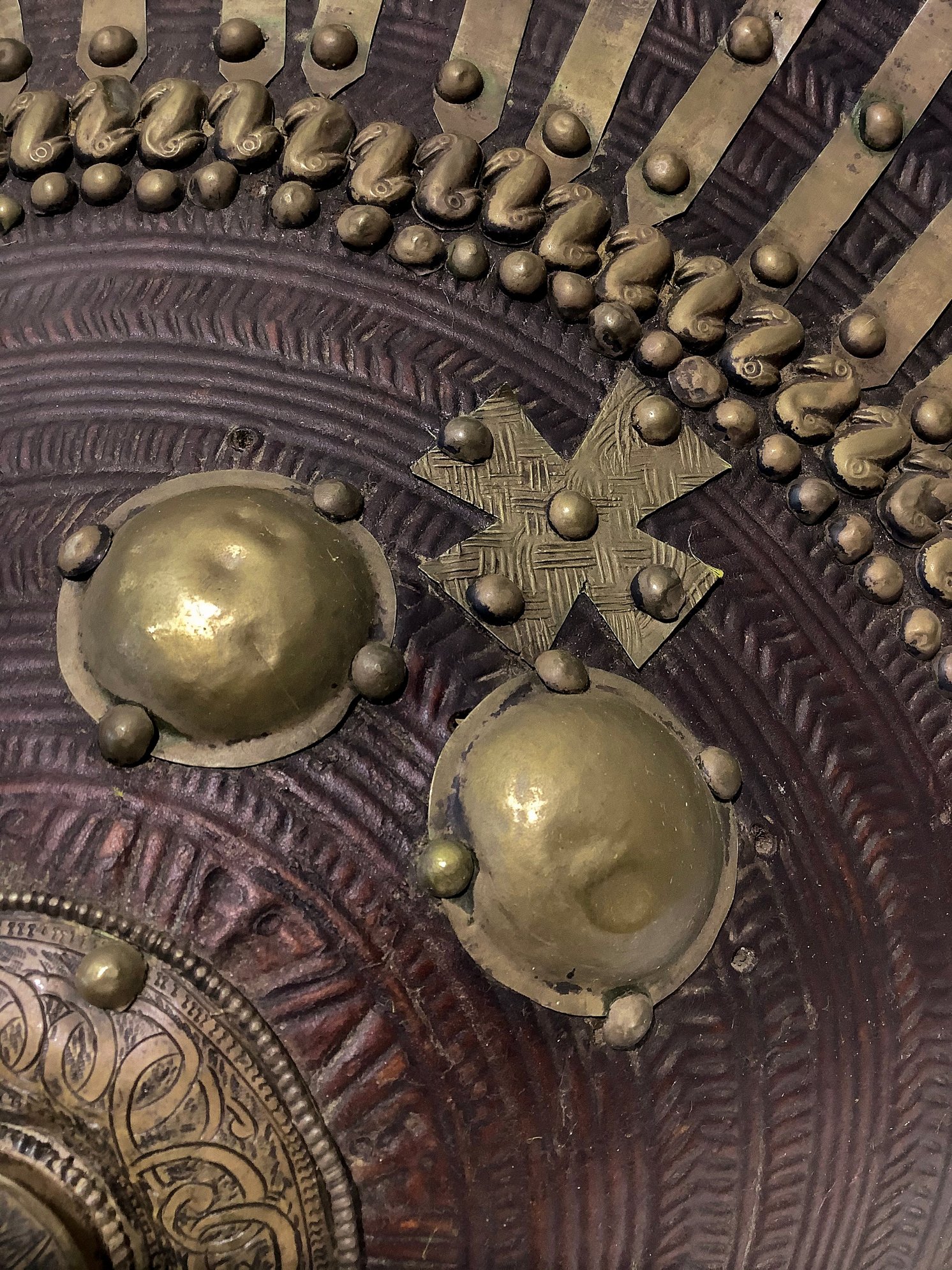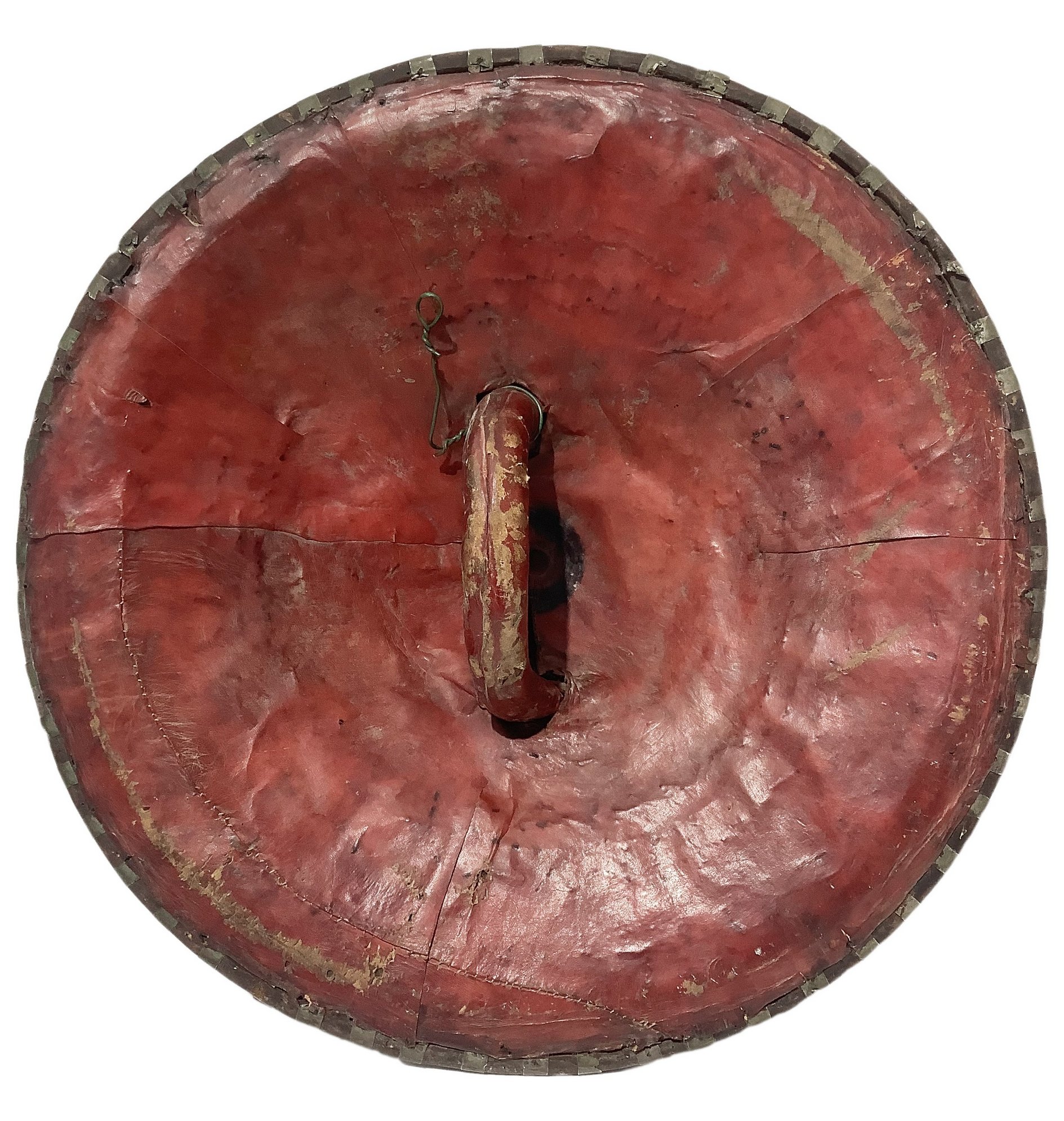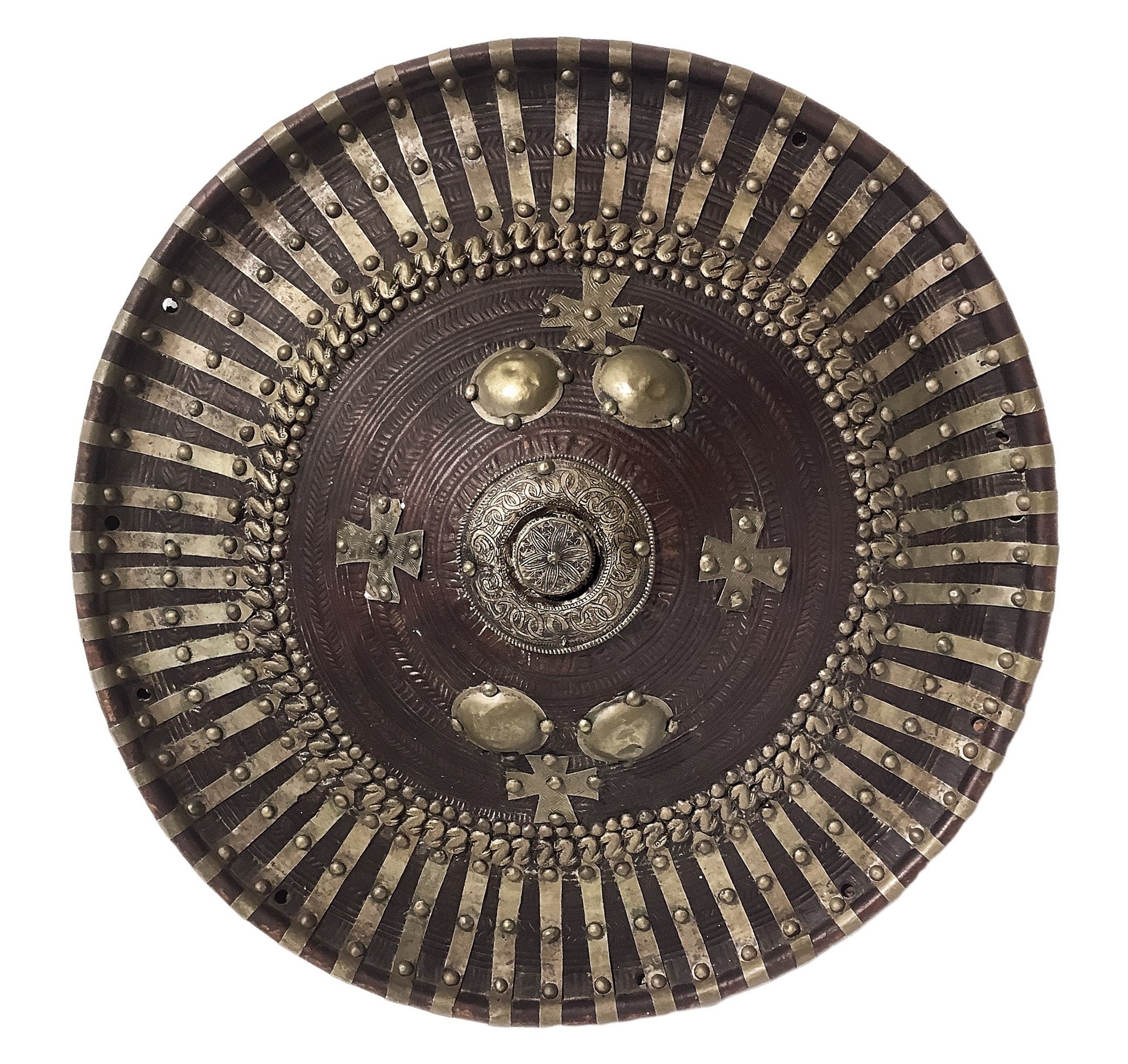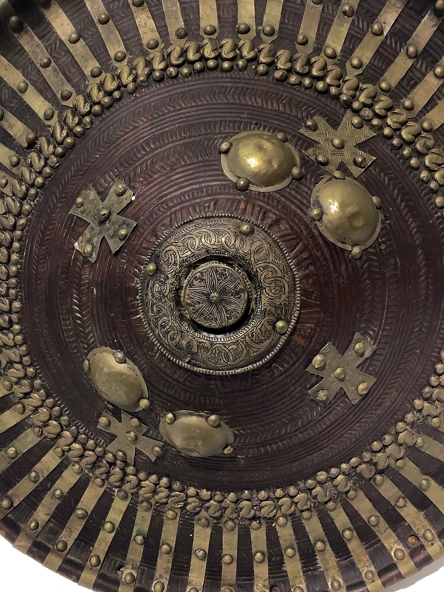 Scudo Etiope da parata, XIX secolo. In cuoio indurito a bordo risvoltato, decorato con liste in metallo dorate traforate e incise a motivi geometrici. Diametro cm 53.