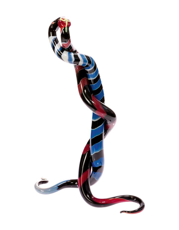 Scultura in vetro policromo raffigurante coppia di serpenti allacciati.