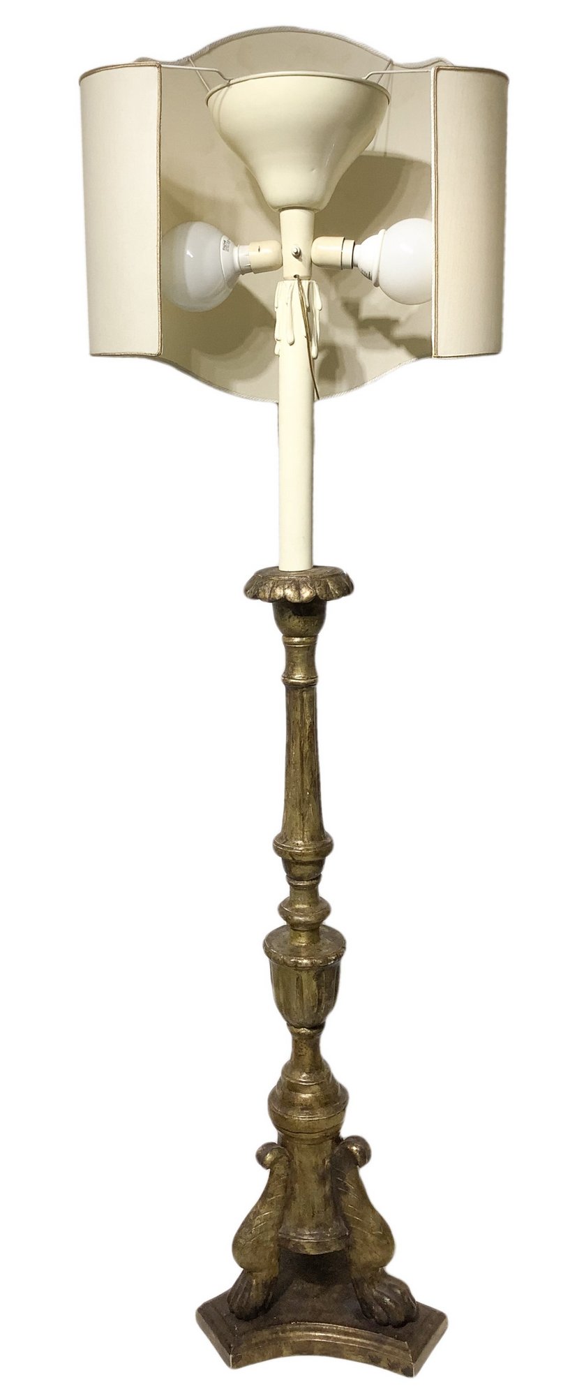 Candeliere da terra in legno dorato con paralume, XIX secolo. H cm 200.