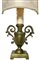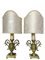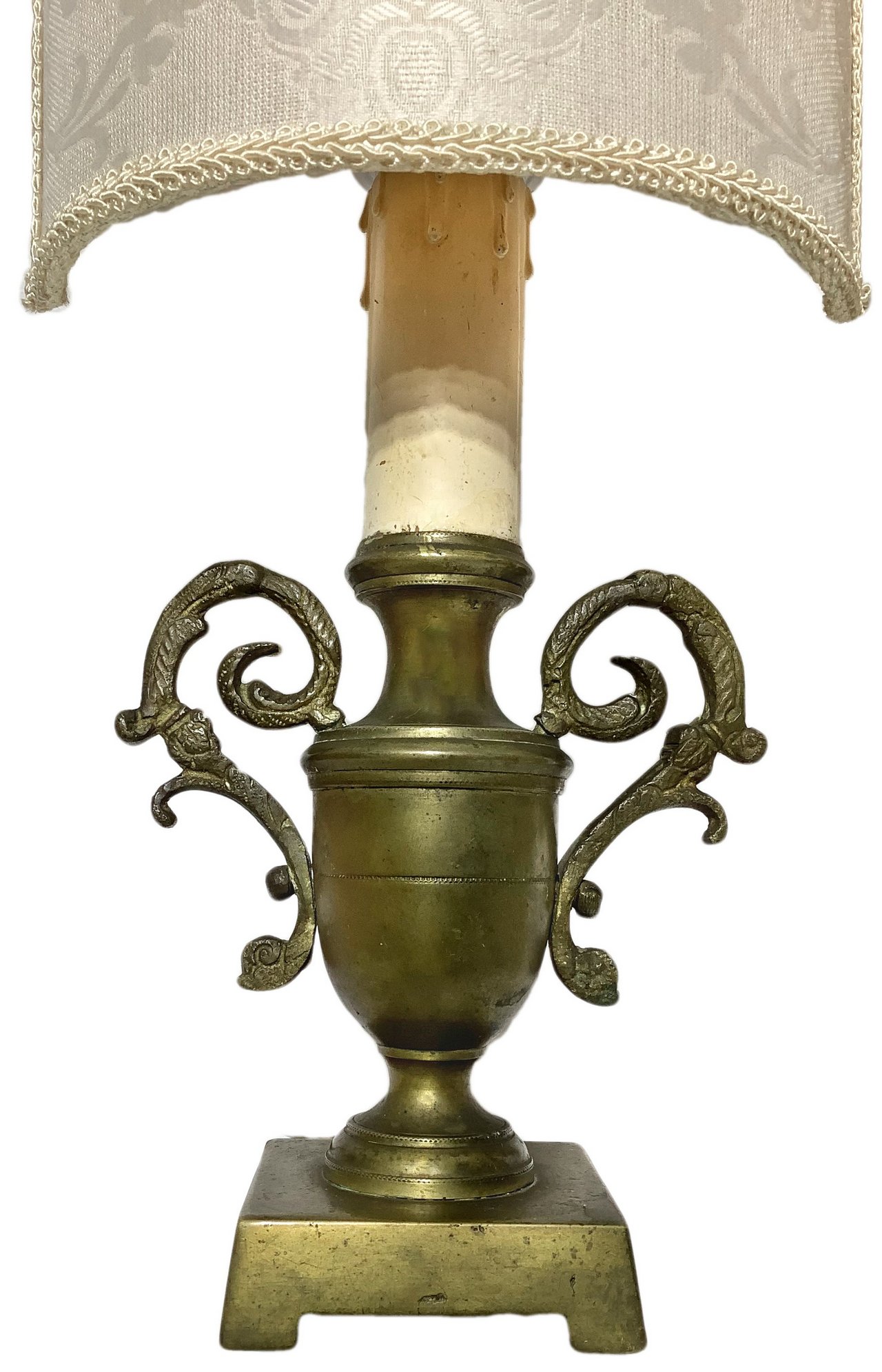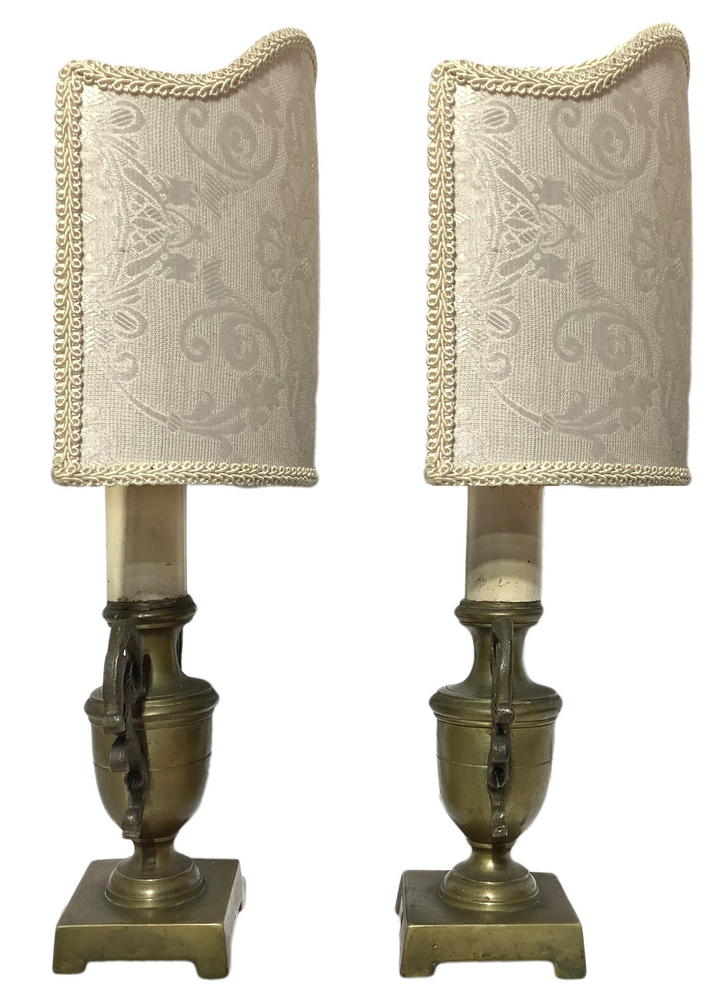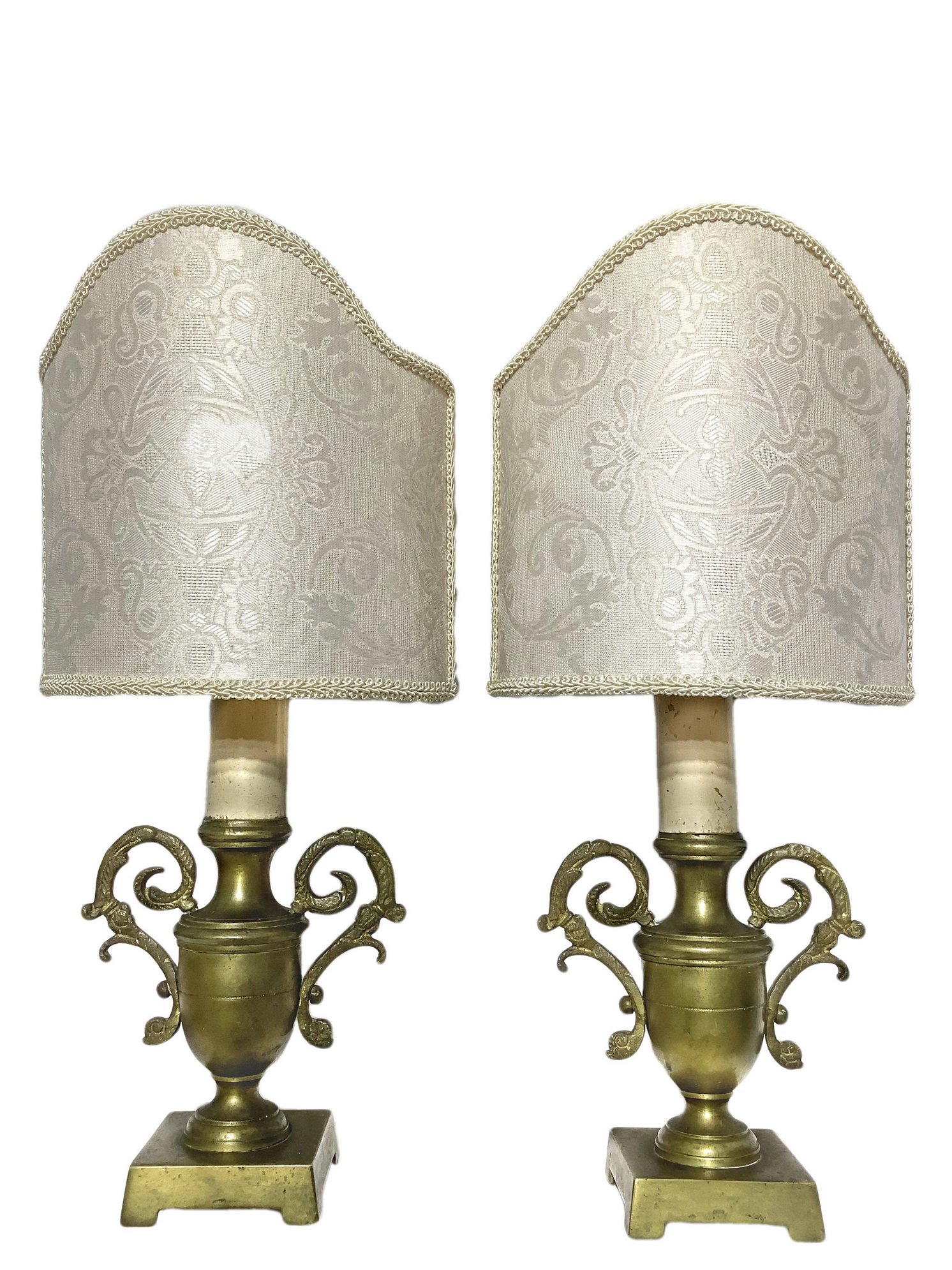 Coppia di piccoli lumi in bronzo dorato a forma di anfore, con ventole, XIX...