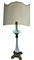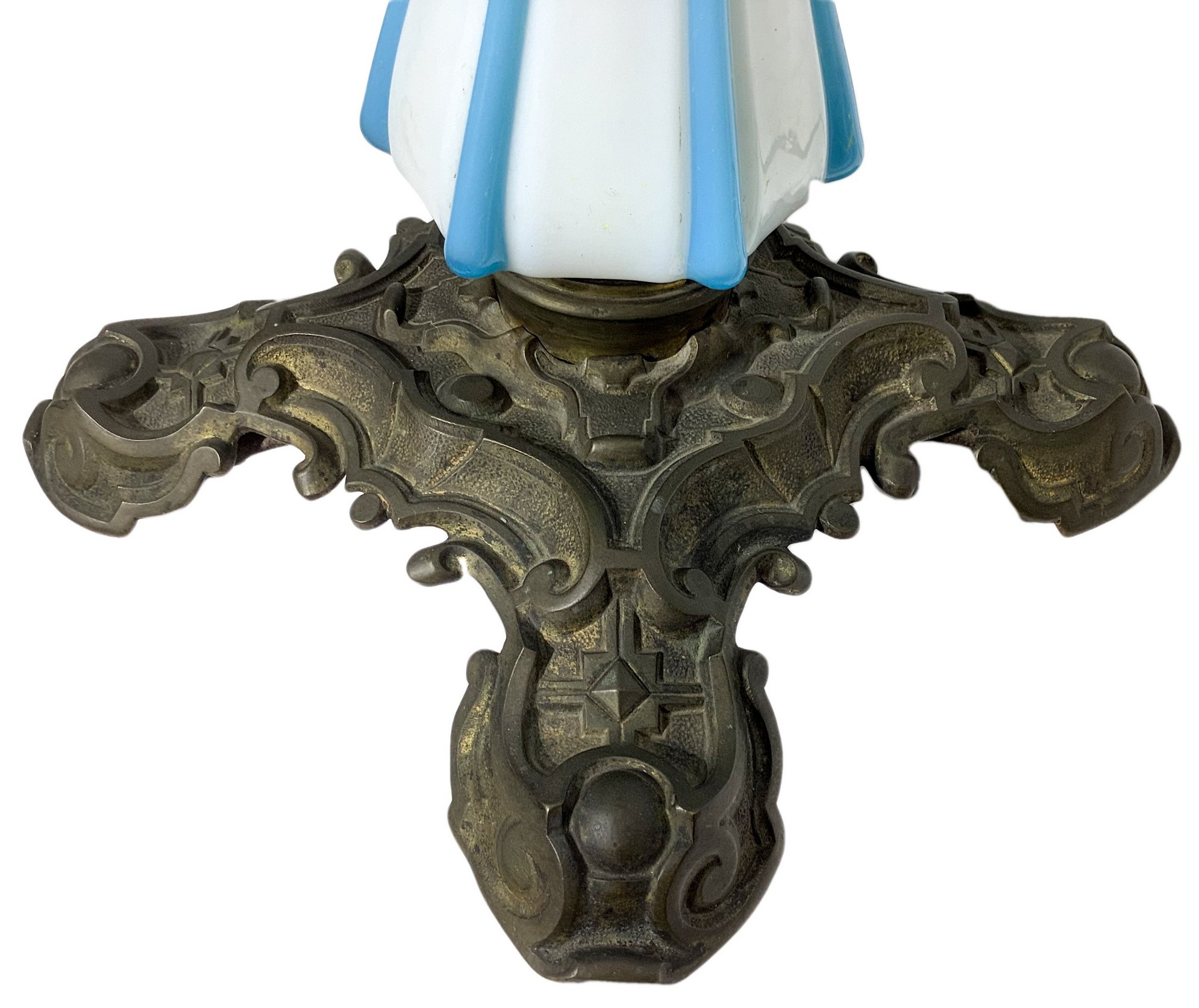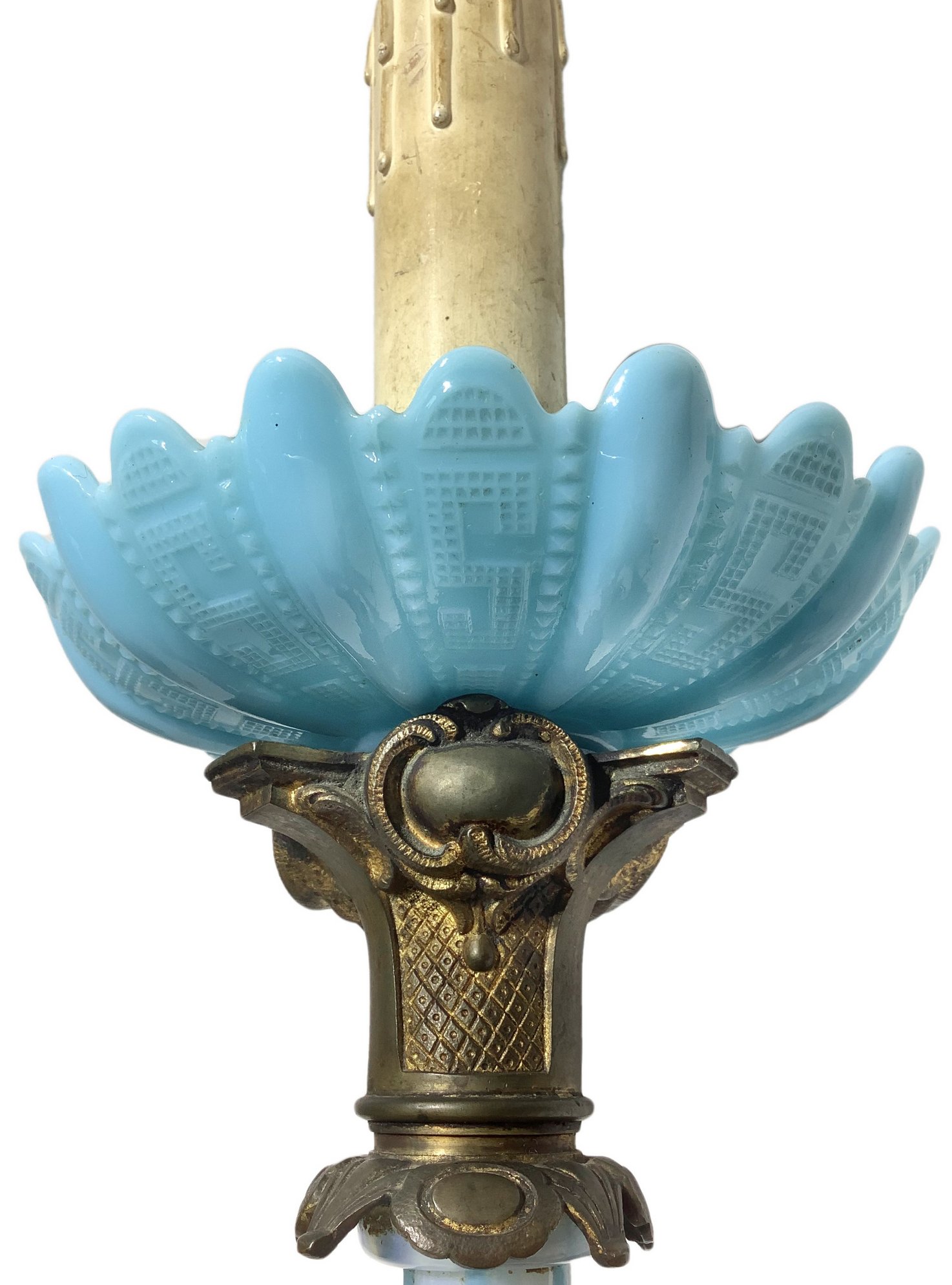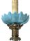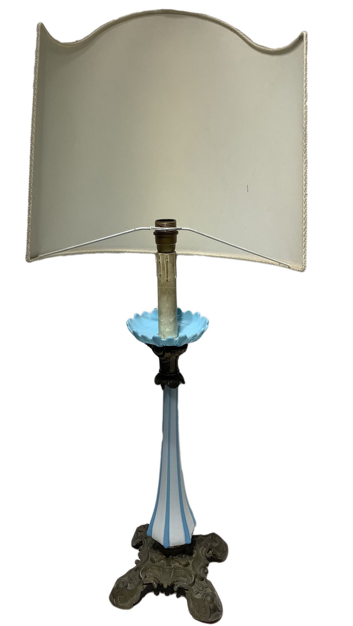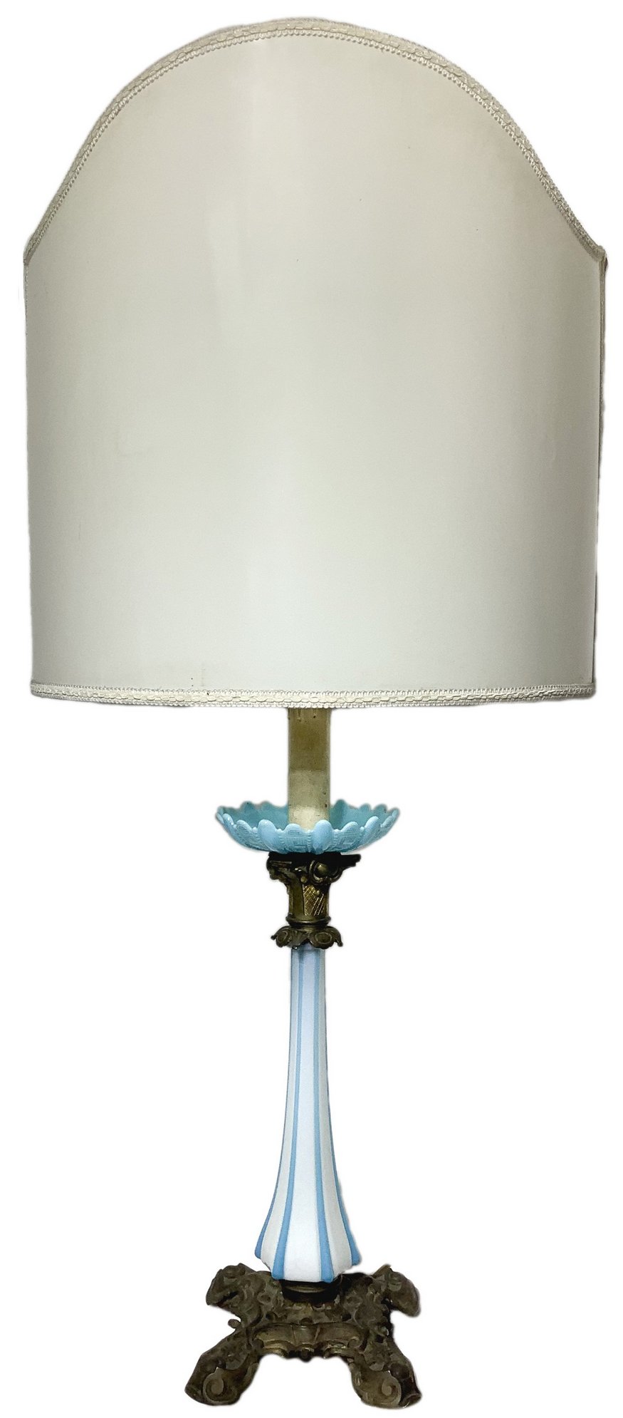Lume in vetro opaline di colore bianco e celeste, base in bronzo dorato, con...