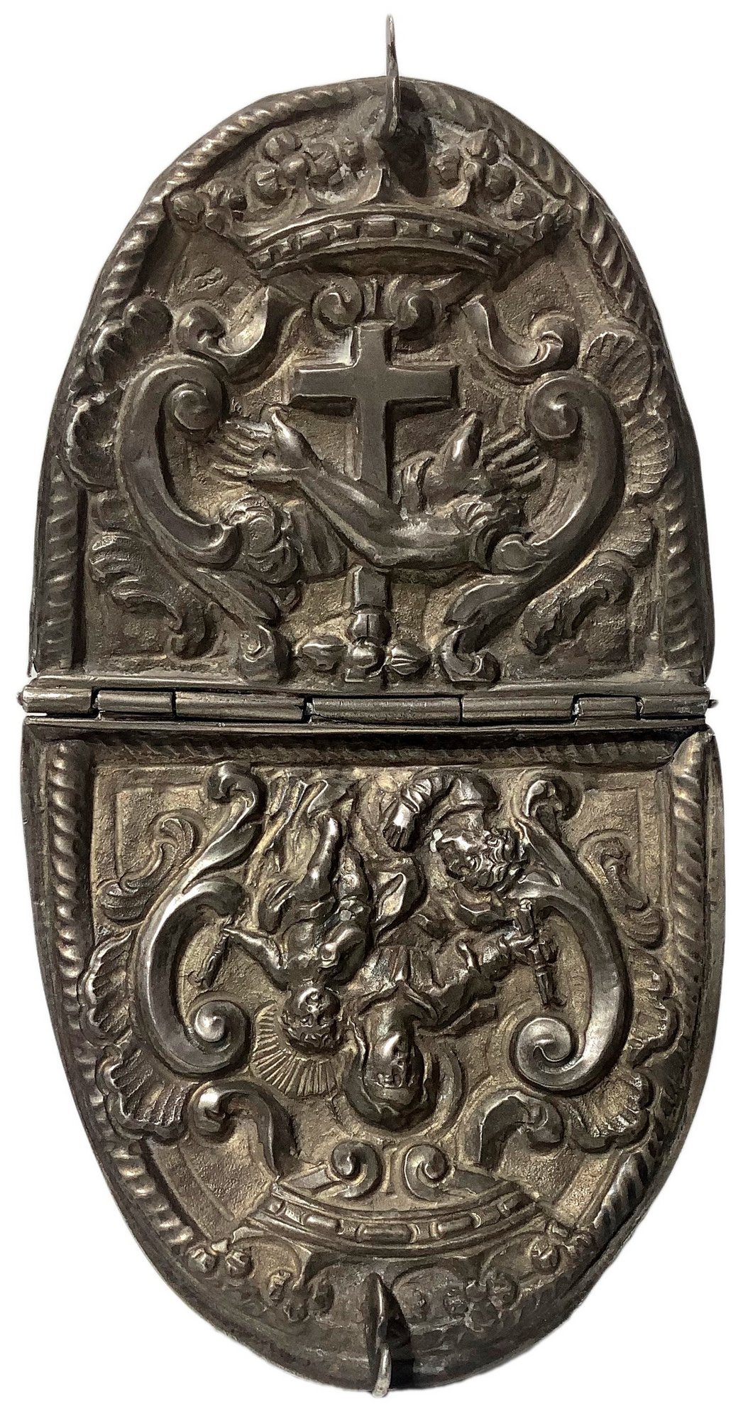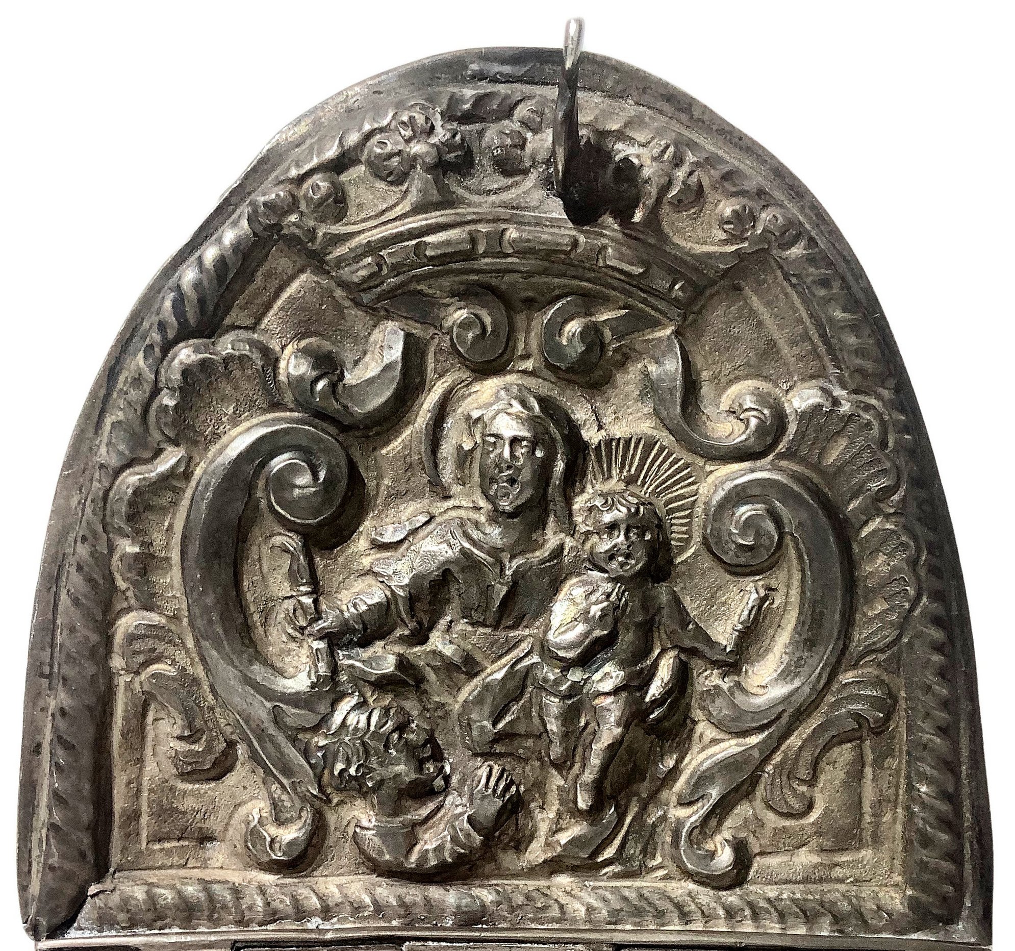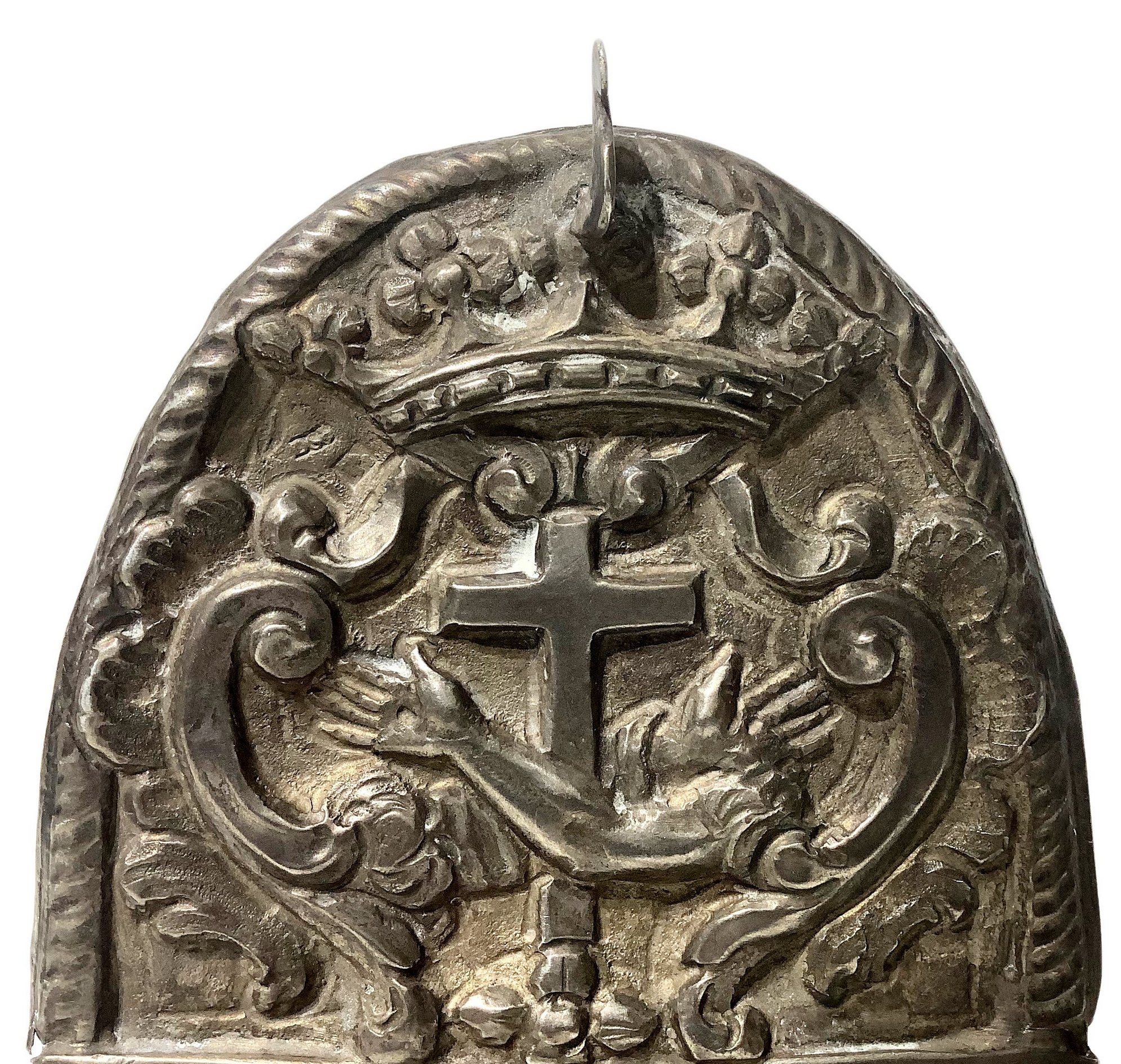 Lotto 528 | Navetta porta incenso in argento, sul coperchio raffigurazione di Sacra...