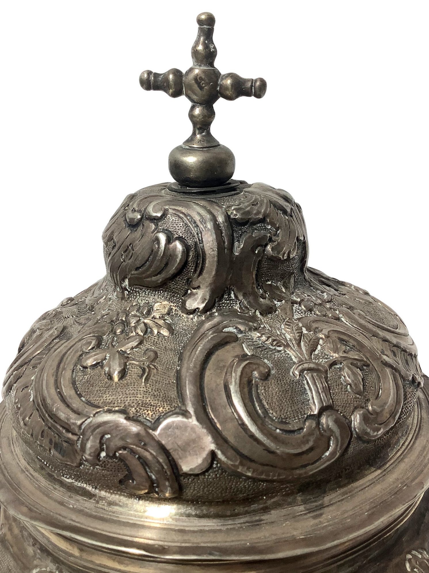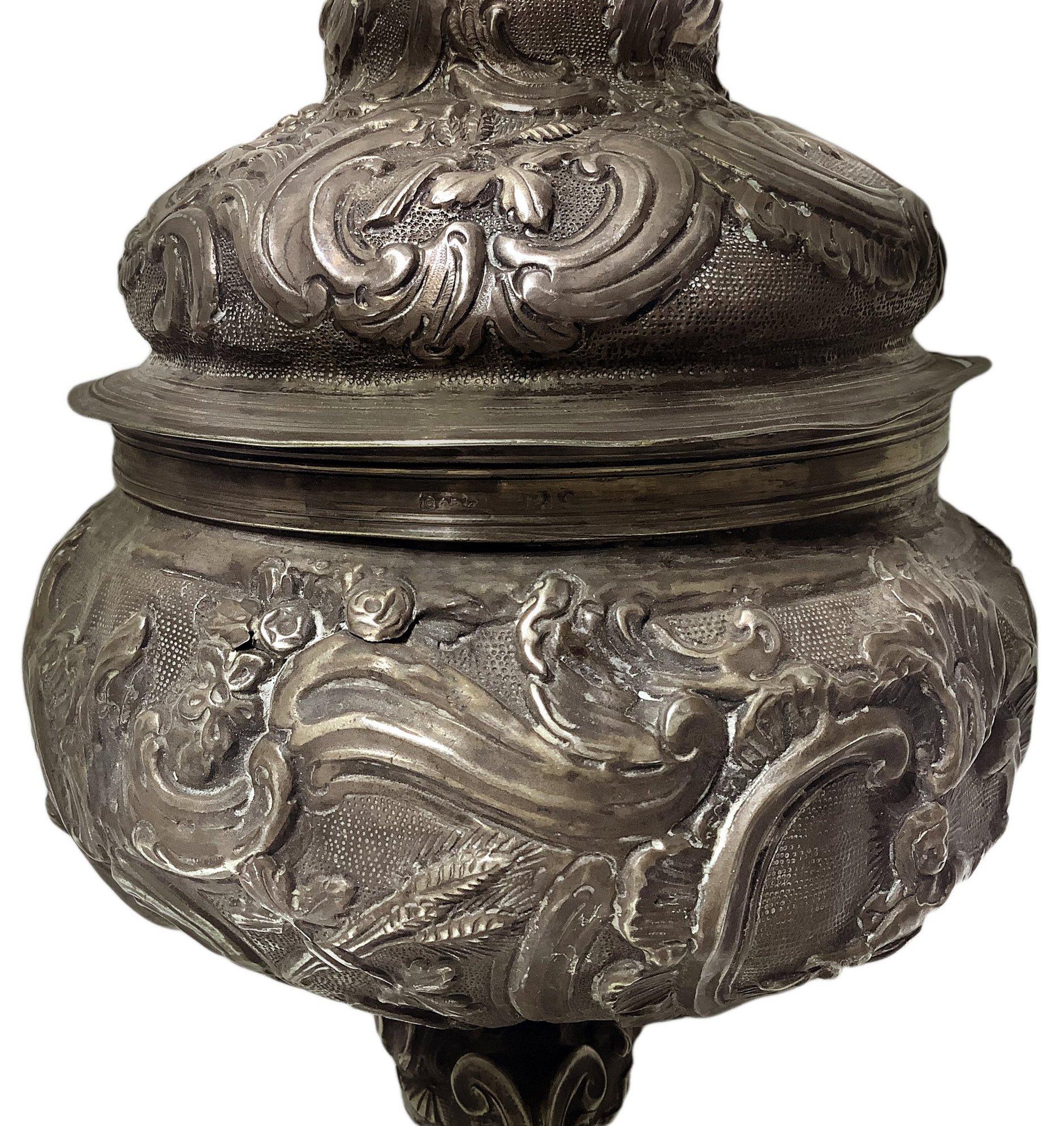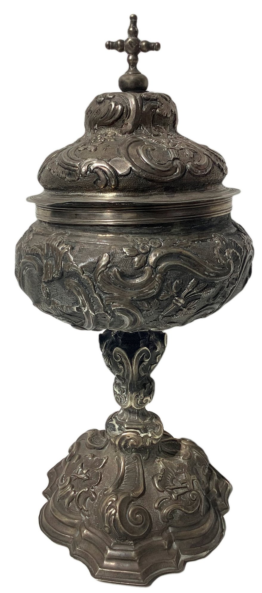 Pisside in argento. H cm 31,6, base circolare smerlata cm 13. Mancanze e ammaccature.