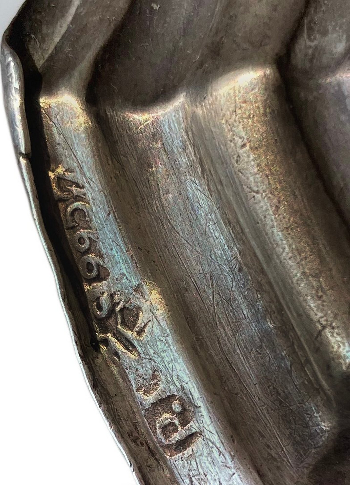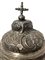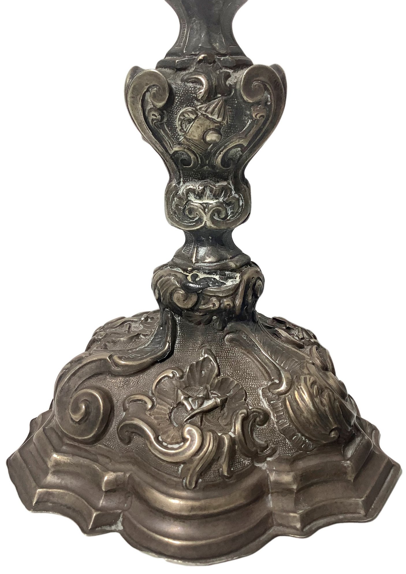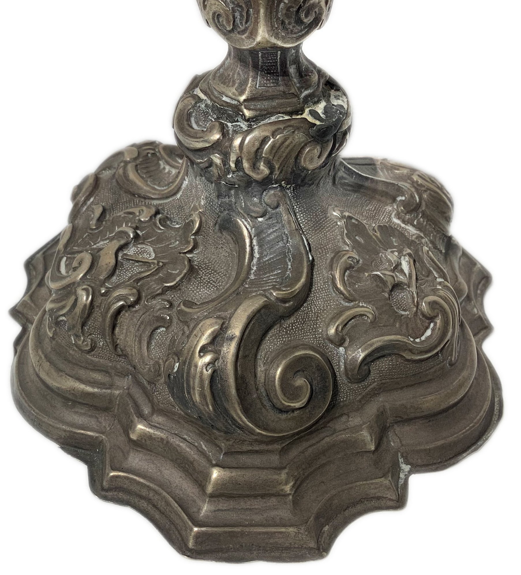 Pisside in argento. H cm 31,6, base circolare smerlata cm 13. Mancanze e ammaccature.