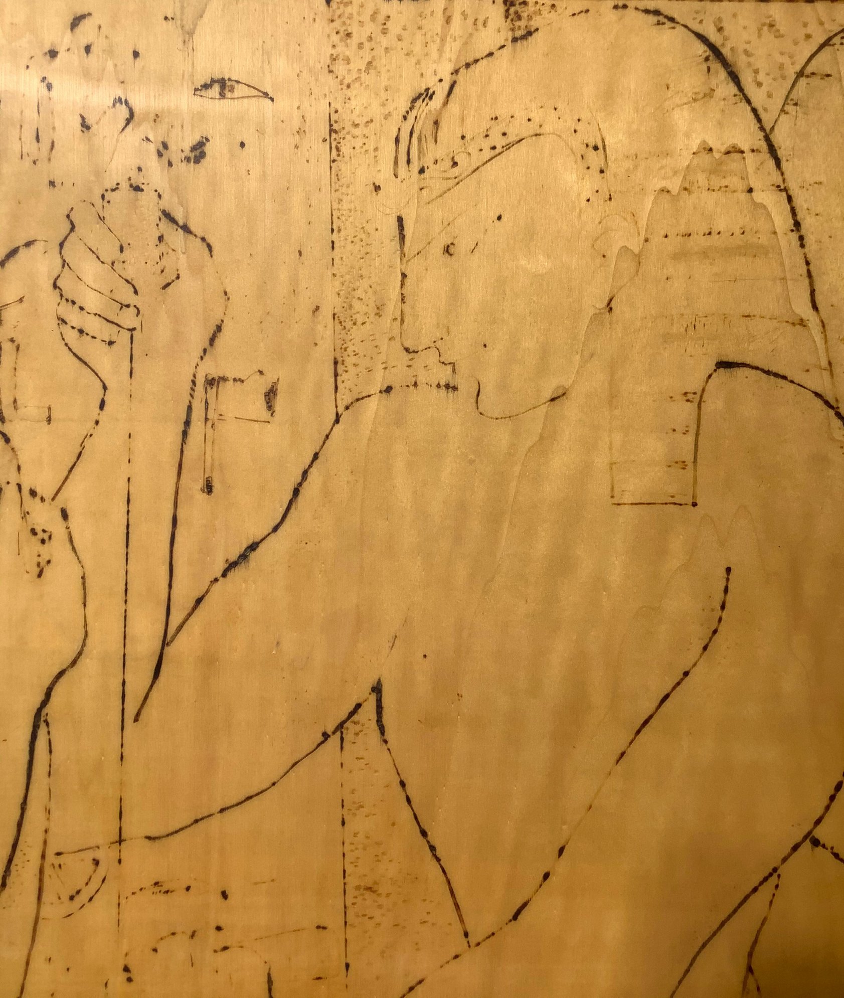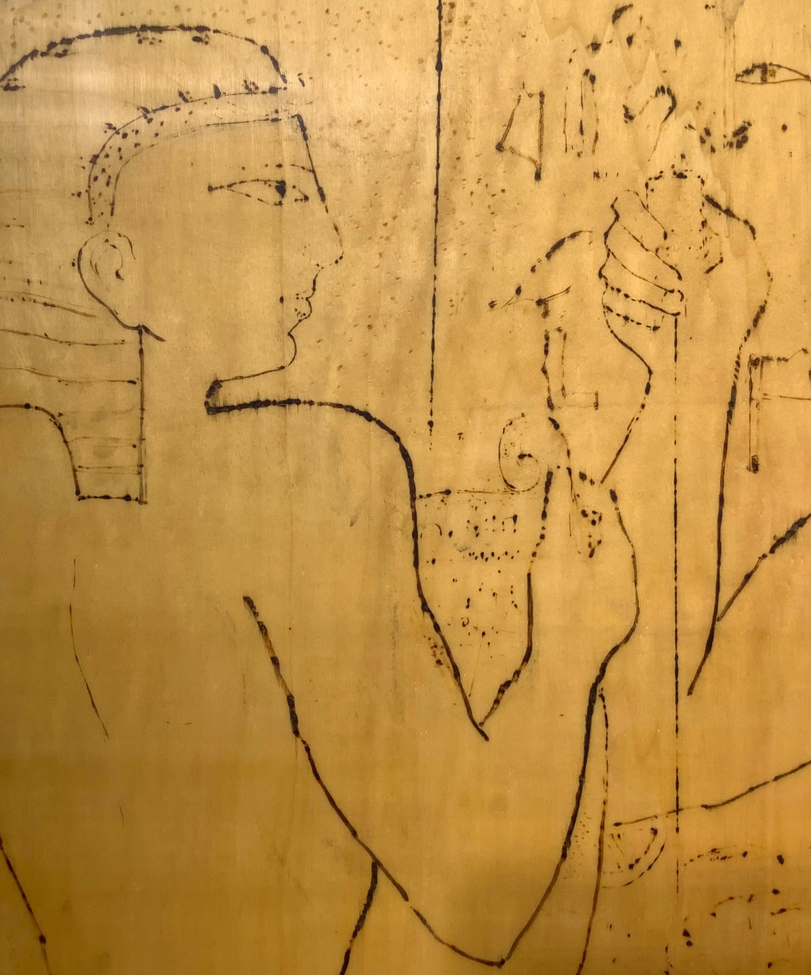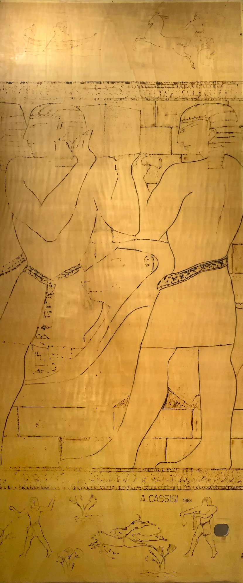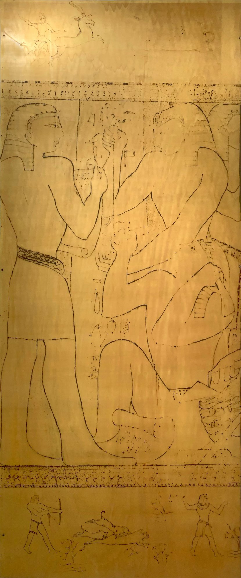 Pannello lastronato in legno di acero raffigurante scene egizia. Composto da n.3 elementi, tecnica pirografica, firmato in basso a destra A.Cassisi, datato 1963 - H cm 239x291