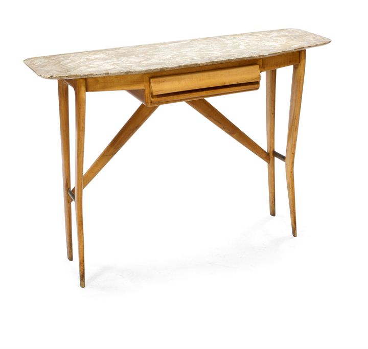 Console in legno di acero con traverse in ottone. Piano superiore in marmo a macchie con bordo rastremato.