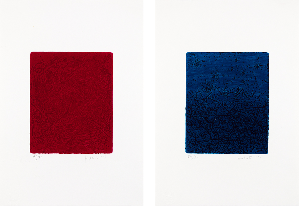 Cartella contenente due acquaforti acquetinte, ciascuna recante firma e numerazione (Esemplari 29/30) a matita al fronte