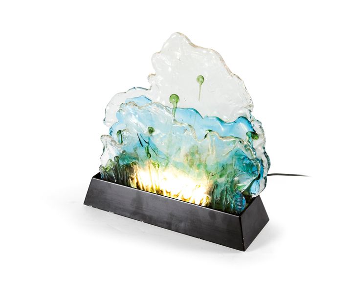 Lampada da tavolo composta da due lastre in vetro di Murano a strati policromi e trasparenti.
