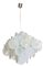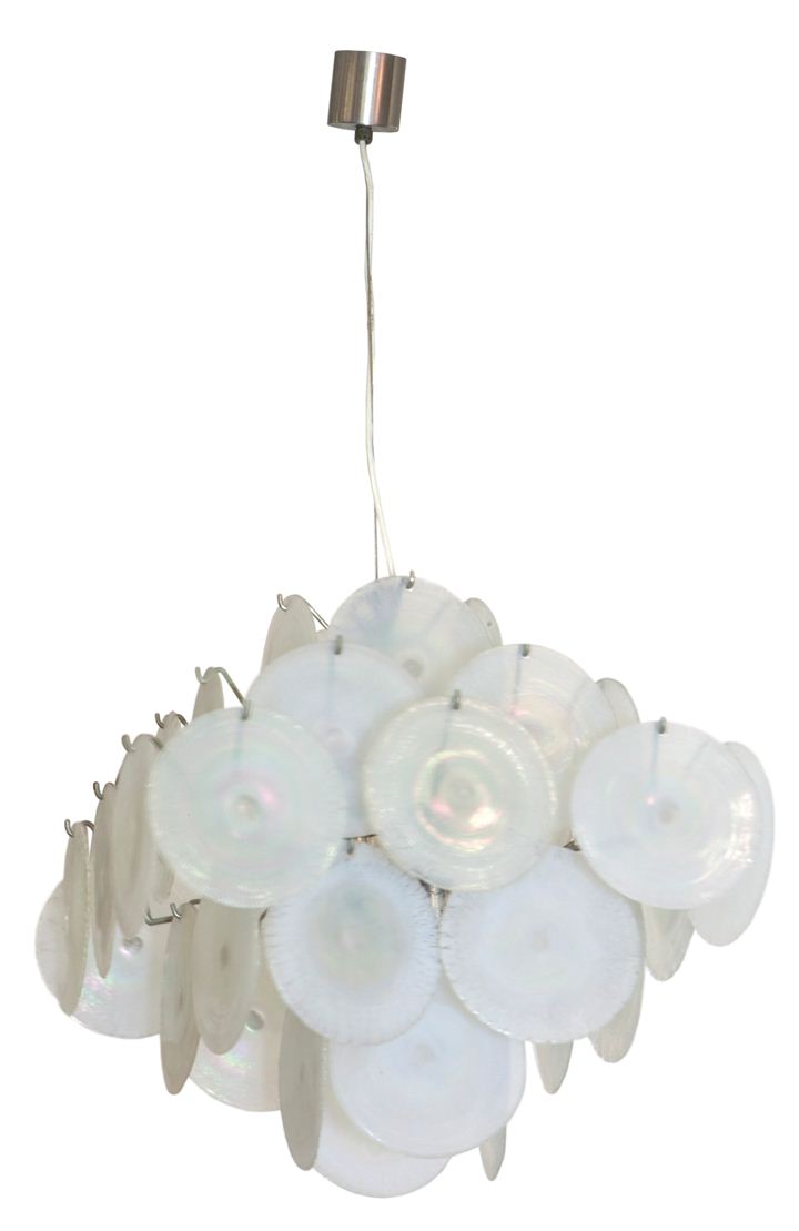 Lampadario a cinque ordini di dischi in vetro soffiato con superficie iridescente.