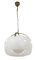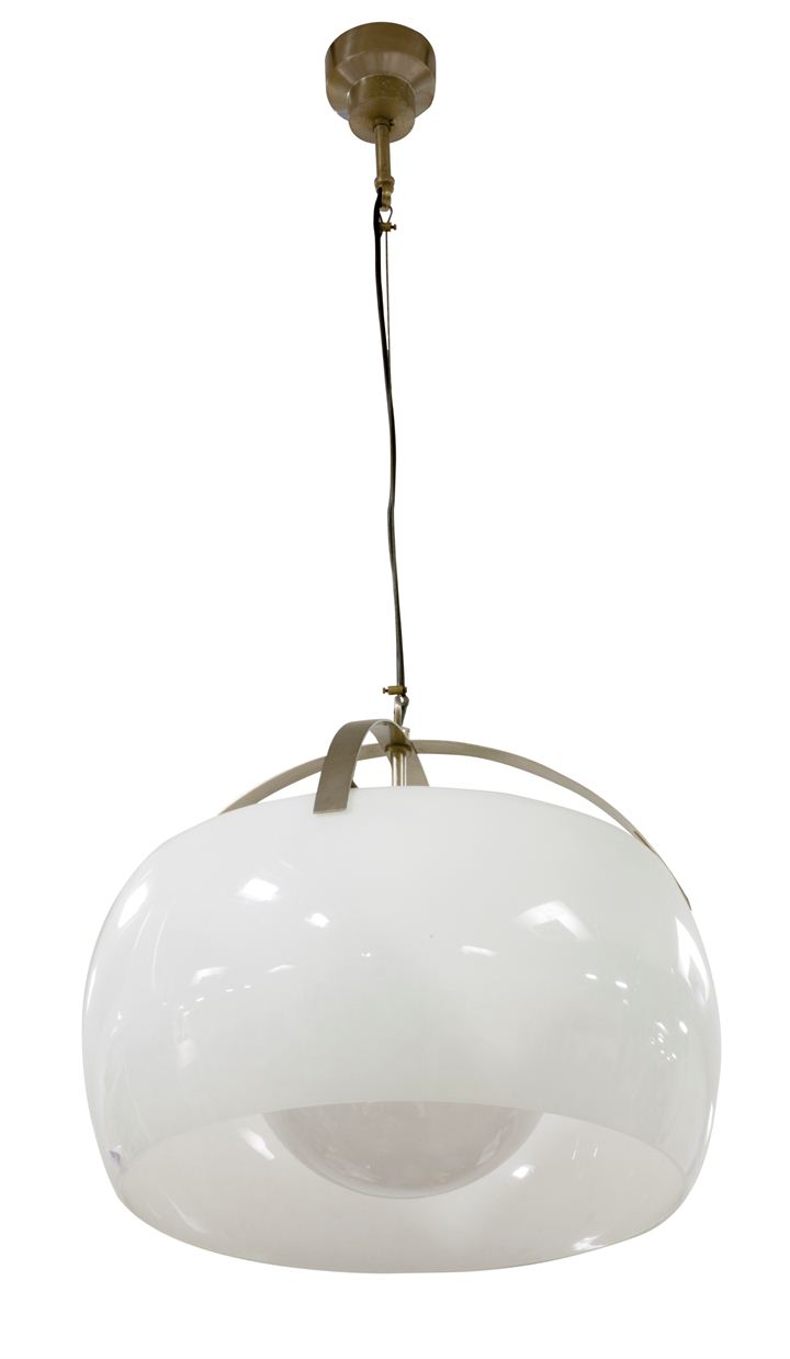 Lampada a sospensione in ottone nichelato opaco e vetro fumato bianco.