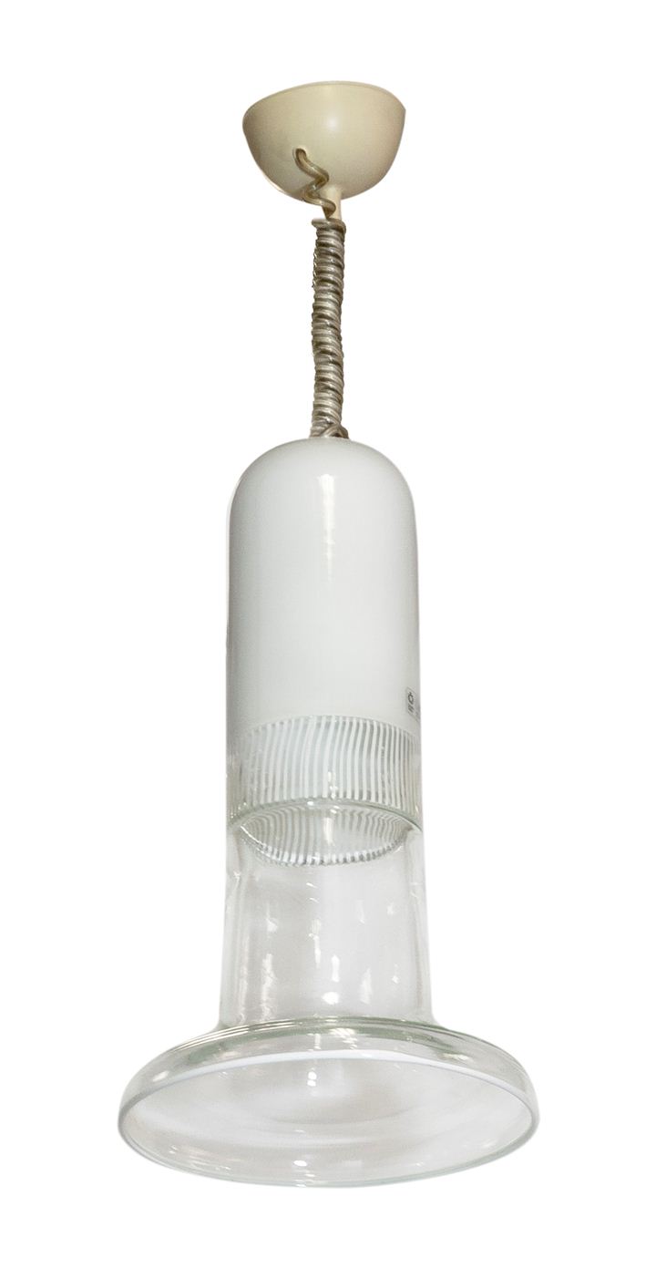 Lampada a sospensione con diffusore a incalmo in vetro bianco opalino incamiciato triplo,