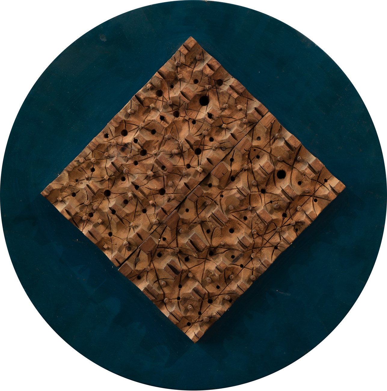 Scultura in legno intagliato e sagomato applicata su tavola dipinta - Pezzo unico