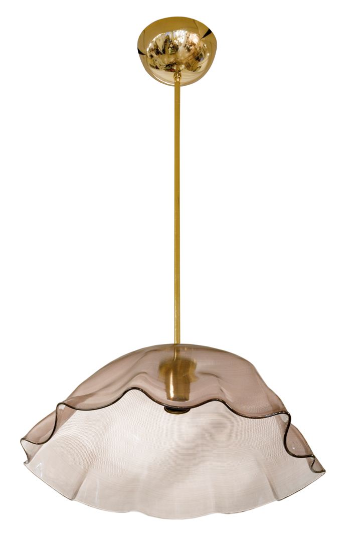 Lampada a sospensione della serie “Crinoline” in vetro a filigrana. Montatura in metallo dorato.