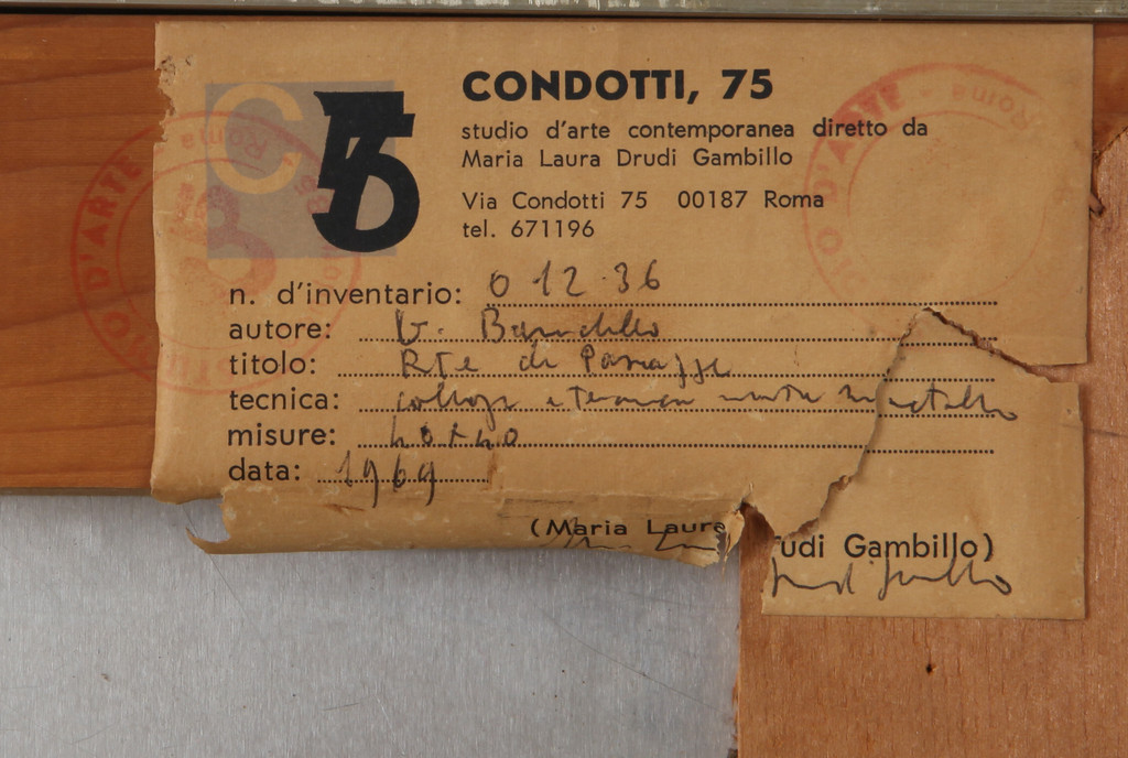 sul retro: etichetta della Galleria Condotti 75 Roma