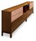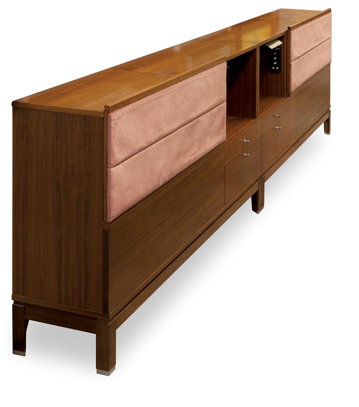 Coppia di comodini contenitori a testile in legno di teak, ante rivestite in velluto.