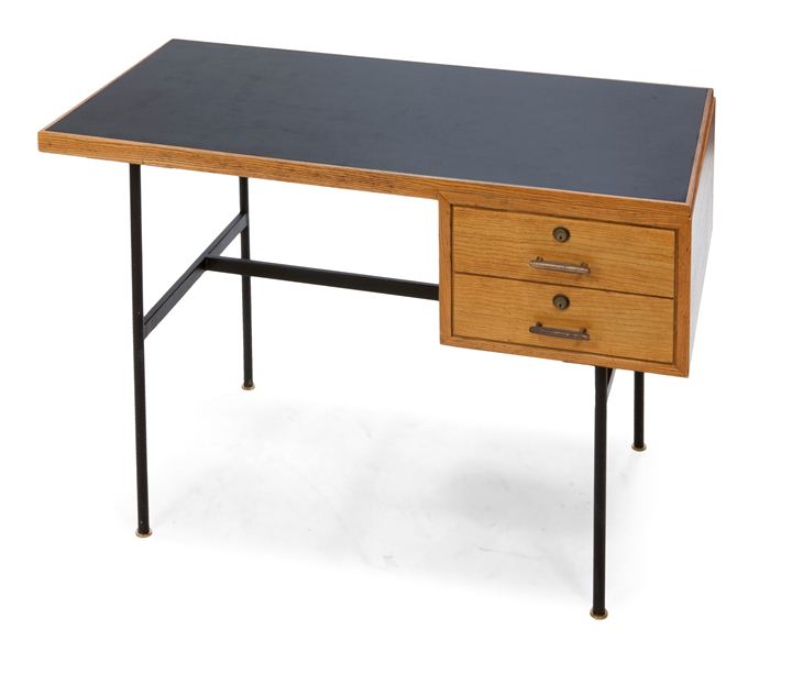 Scrittoio con struttura in metallo laccato nero, cassettiera in legno di rovere e piano in laminato plastico nero.