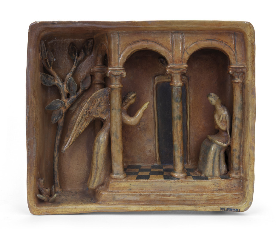 'L'annunciazione' formella a rilievo in maiolica a lustro metallico anni'50.