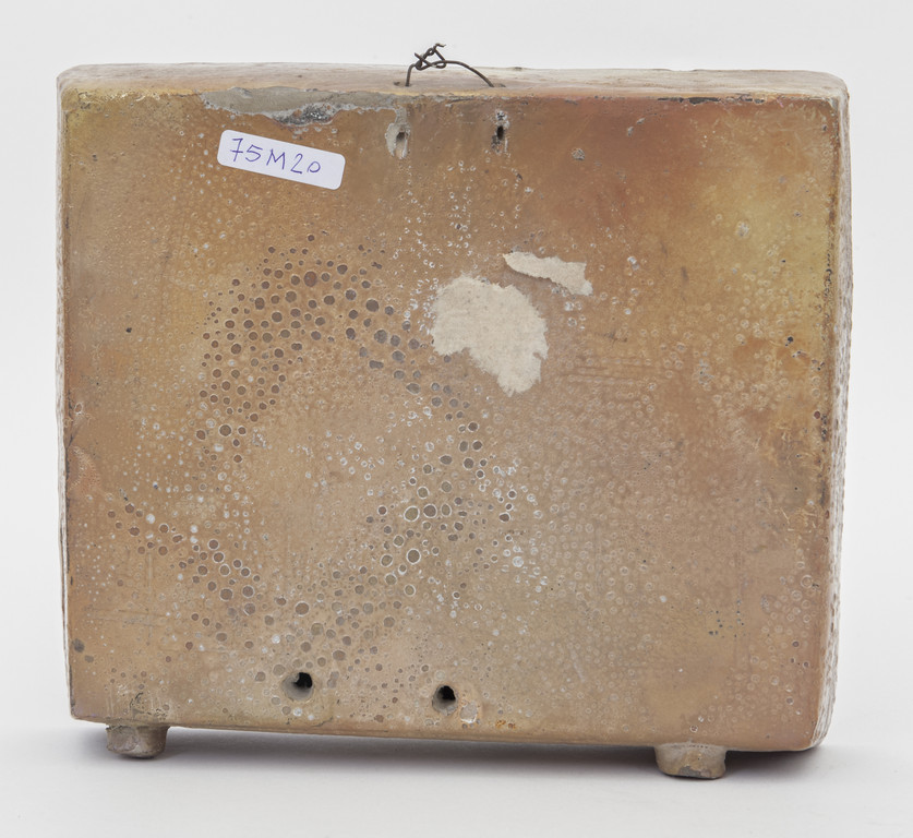 'The Annunciation' relief tile in majolica with metallic luster 1950's.