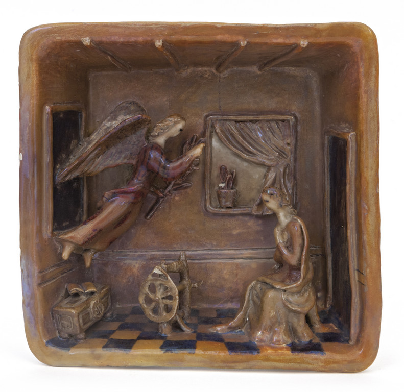 'L'annunciazione' formella a rilievo in maiolica a lustro metallico anni '50.