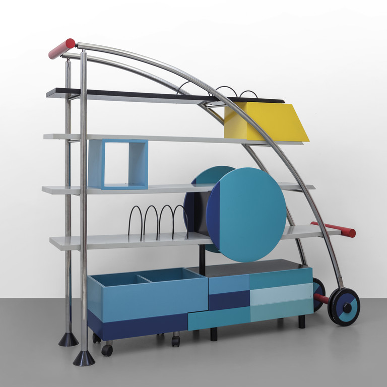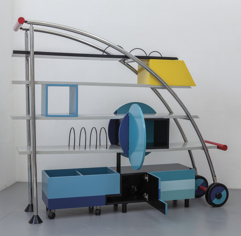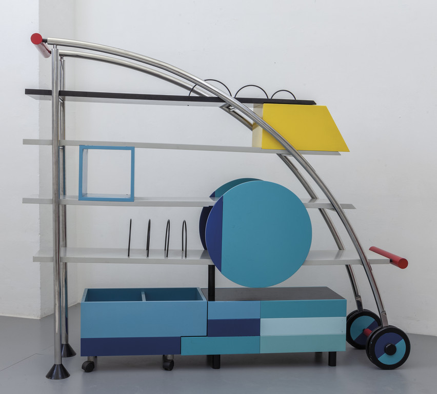Chrome-plated metal varnished metal and painted wood.