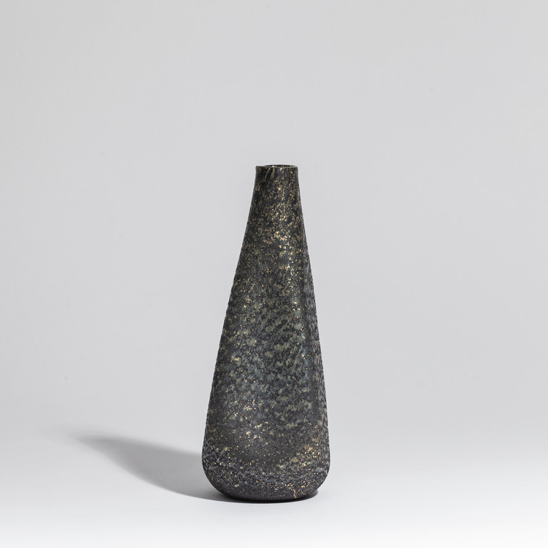 Un vaso 'barbarico dorato' in vetro nero bluastro screziato con foglia oro ' 1951.