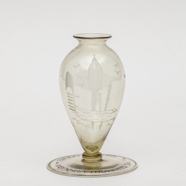 Un piccolo vaso in vetro trasparente inciso con iscrizione a smalto della compagnia circa 1920.