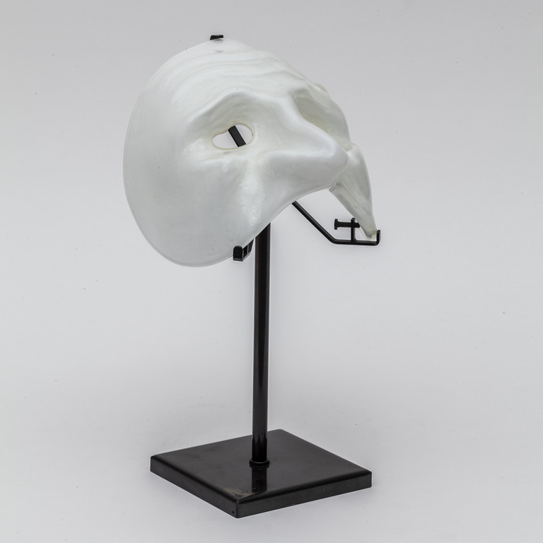 Una maschera 'pantalone' in vetro lattimo con supporto in metallo verniciato nero 1988.