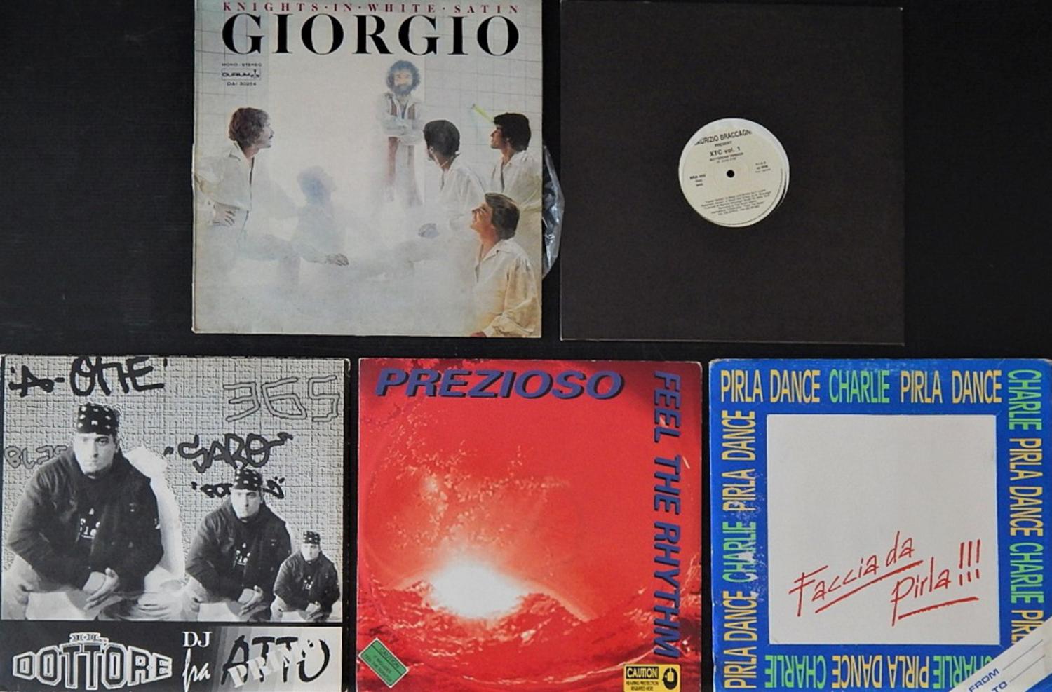 Lotto di 3 vinili 33 giri e 2 vinili 45 giri di genere 'musica elettronica/hip hop italiana':