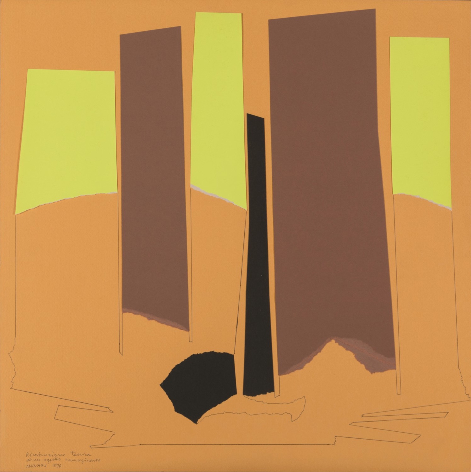 B. Titolato, datato e firmato a sinistra: Ricostruzione teorica di un oggetto immaginario. Munari 1970;