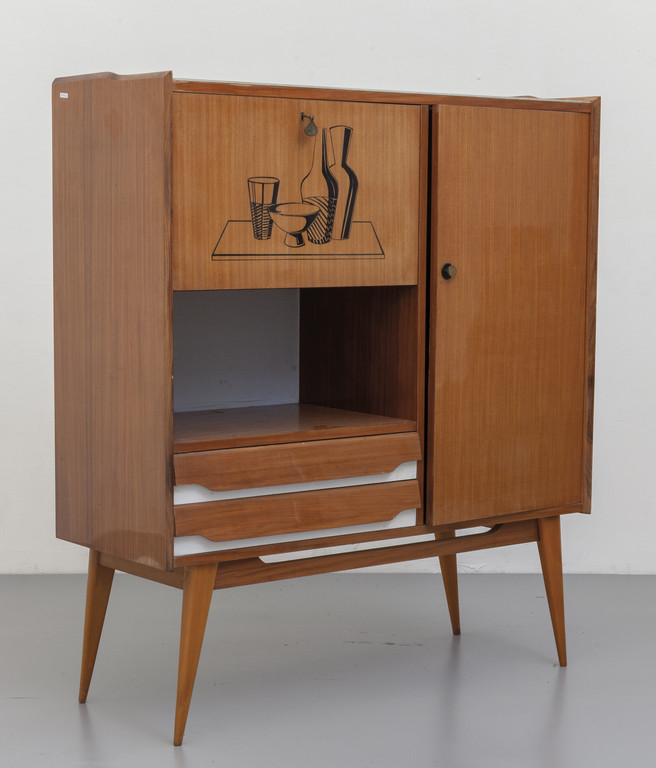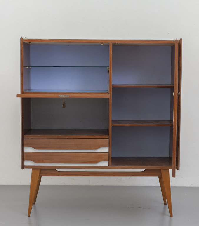 cristallo con carta colorata retro applicata, vano bar con piani in cristallo