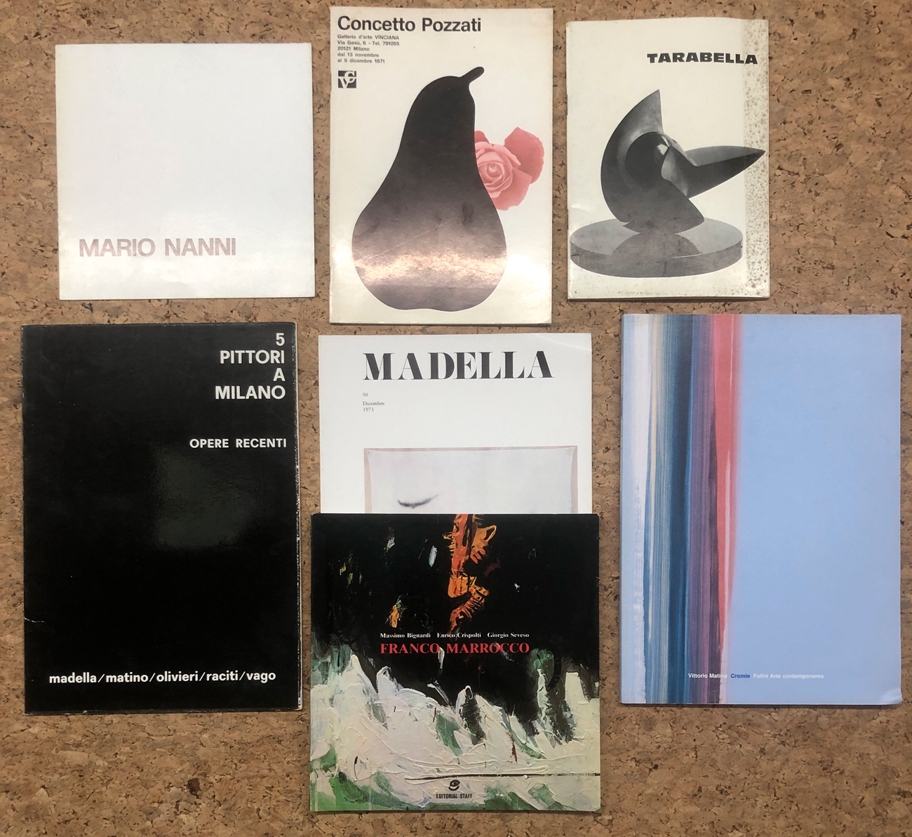Lotto unico di 7 cataloghi inerenti esposizioni dei seguenti artisti: Vittorio Matino, Mario Nanni, Concetto Pozzati, Tarabella, Gianni Madella, Franco Marrocco, 5 pittori a Milano (Madella, Matino, Olivieri, Raciti, Vago)