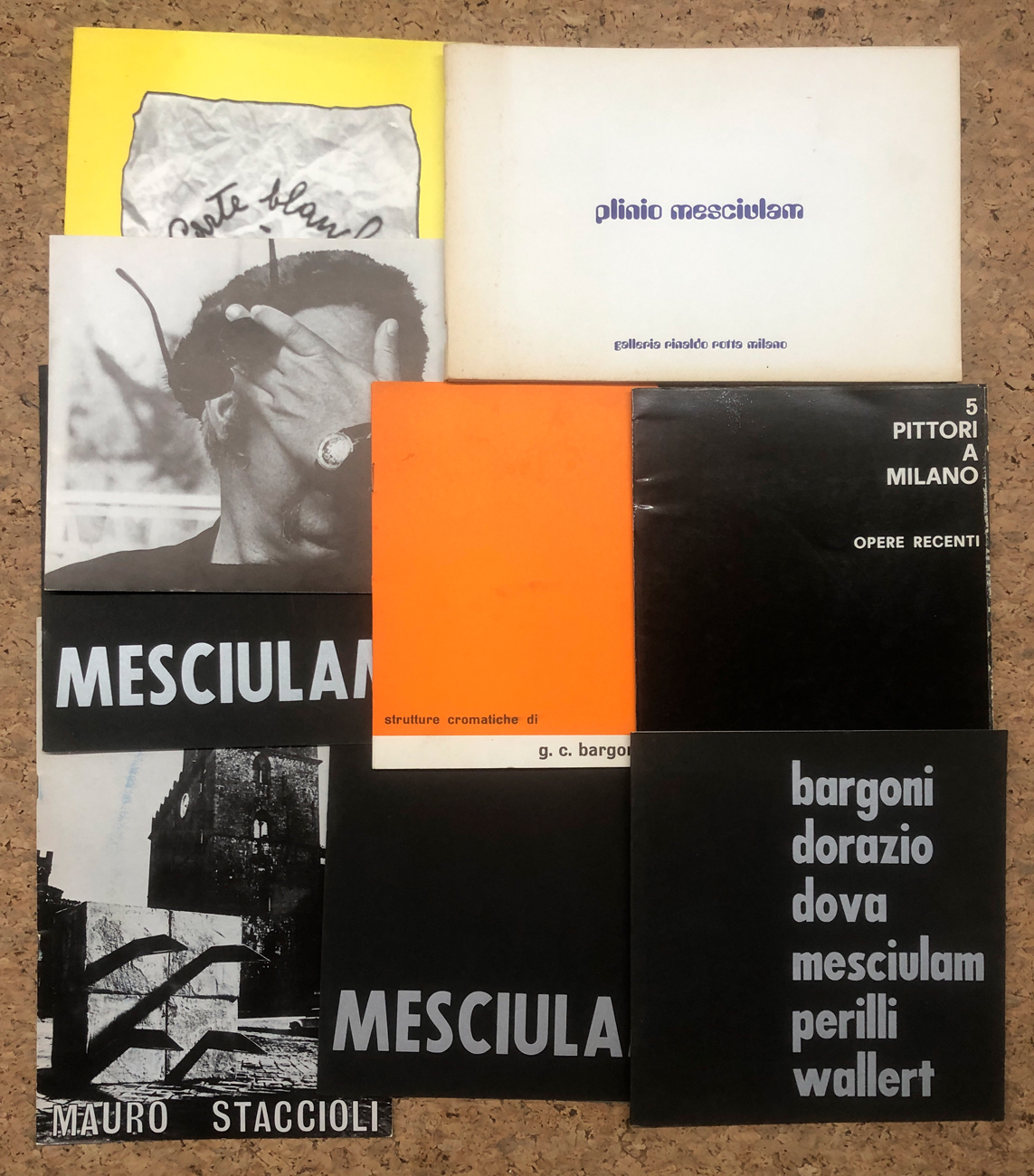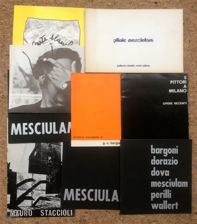 Lotto unico di 9 cataloghi illustrati relativi a storiche esposizioni dei seguenti artisti: Vostell, Plinio Mesciulam (3 cataloghi), Mauro Staccioli, Gian Carlo Bargoni, 5 pittori a Milano (Madella - Matino - Olivieri - Raciti - Vago), collettiva (Mesciulam - Squatriti - Bargoni), collettiva (Bargoni - Dorazio - Dova - Mesciulam - Perilli - Wallert)