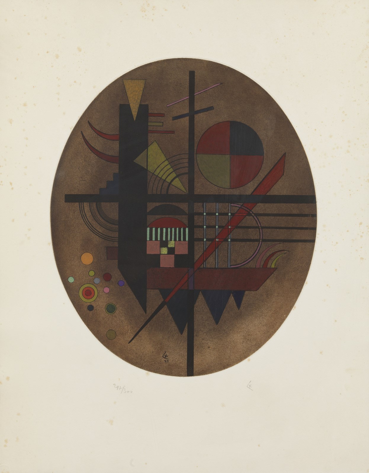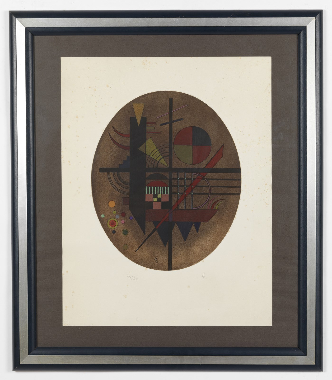KANDINSKY WASSILY (1866 - 1944) Senza titolo. 1925. Acquatinte, Acquaforte. Cm 43,50 x 55,50. 297/300. Tiratura in basso a sinistra a matita. Firma e anno in lastra in basso al centro. Dimensione lastra: 37x31 cm. Difetti. Cornice presente
