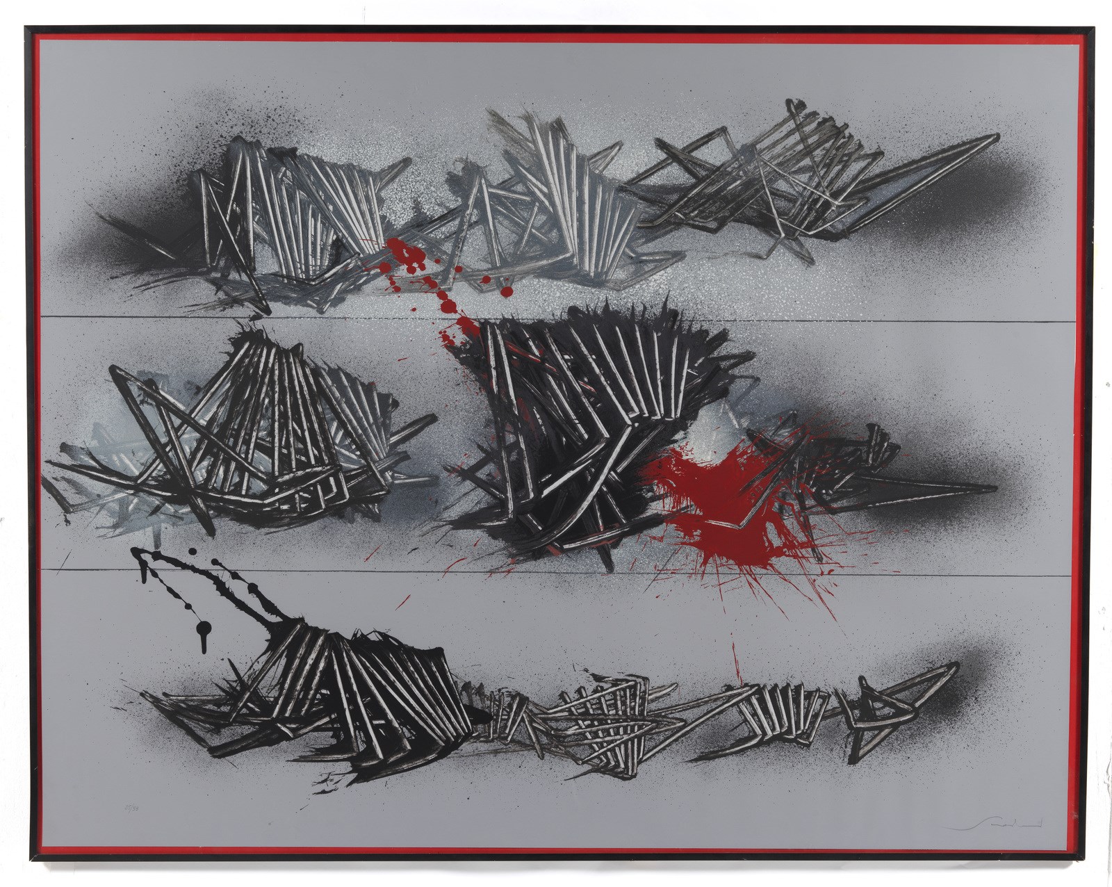 SCANAVINO EMILIO (1922 - 1986) Tramature. Serigrafia. Cm 136,00 x 106,00. 85/99. Tiratura e firma in basso a matita. Al retro cartiglio descrittivo Studio F22, Palazzolo. Cornice presente