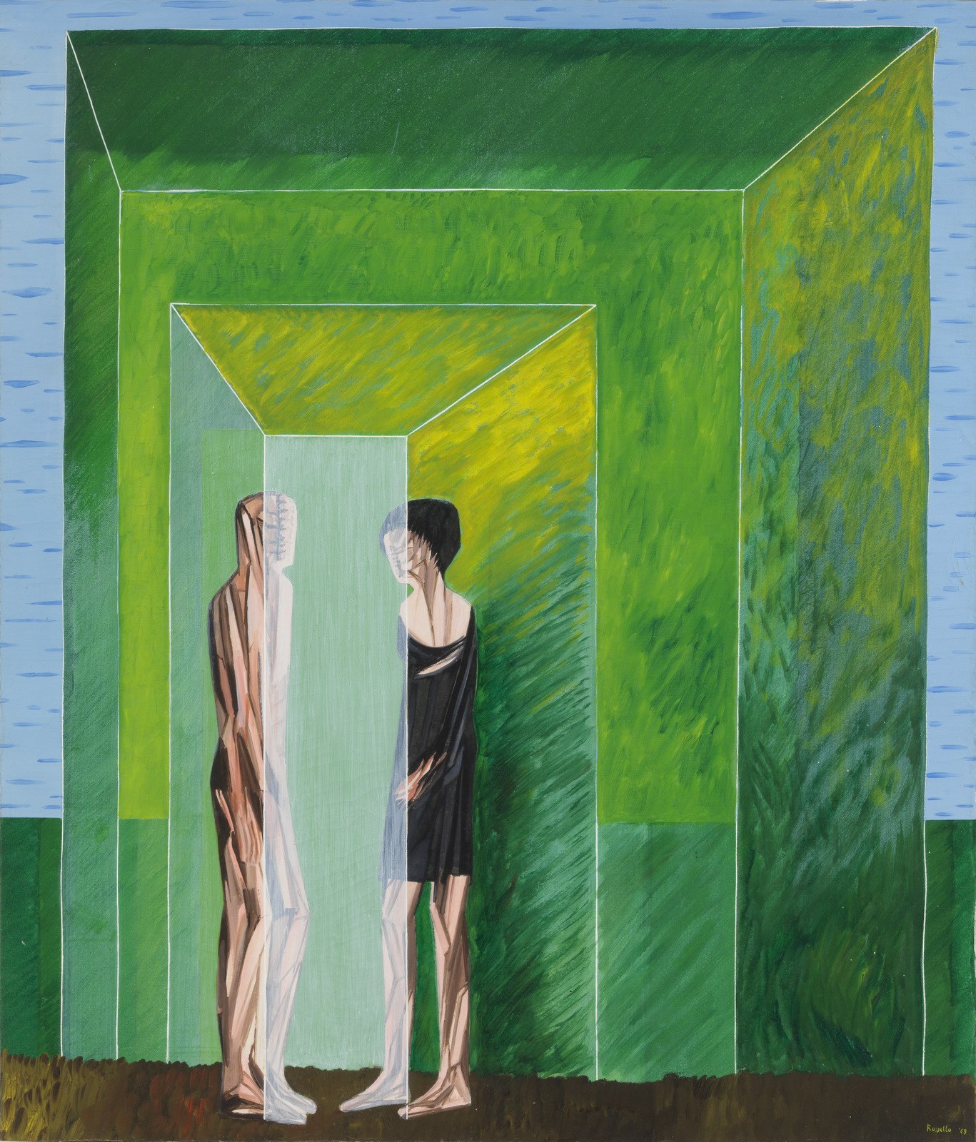 ROSSELLO MARIO (1927 - 2000) Figure in un paesaggio. 1969. Olio su tela . Cm 60,00 x 70,00. Firma e anno in basso a destra. Al retro cartiglio descrittivo Galleria Il Naviglio, Milano, firma, titolo e anno. Provenienza: Collezione Vittorio Notarnicola. . Cornice presente