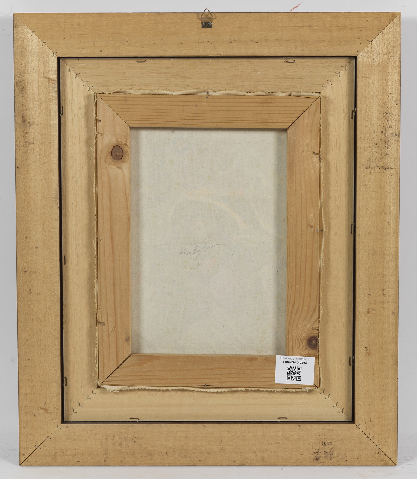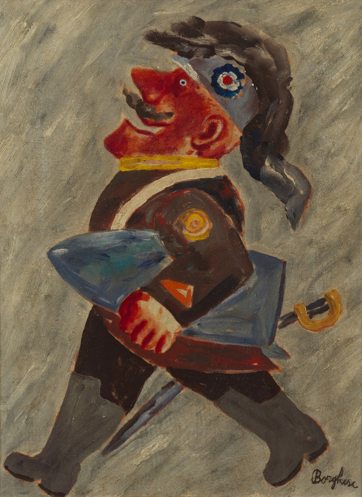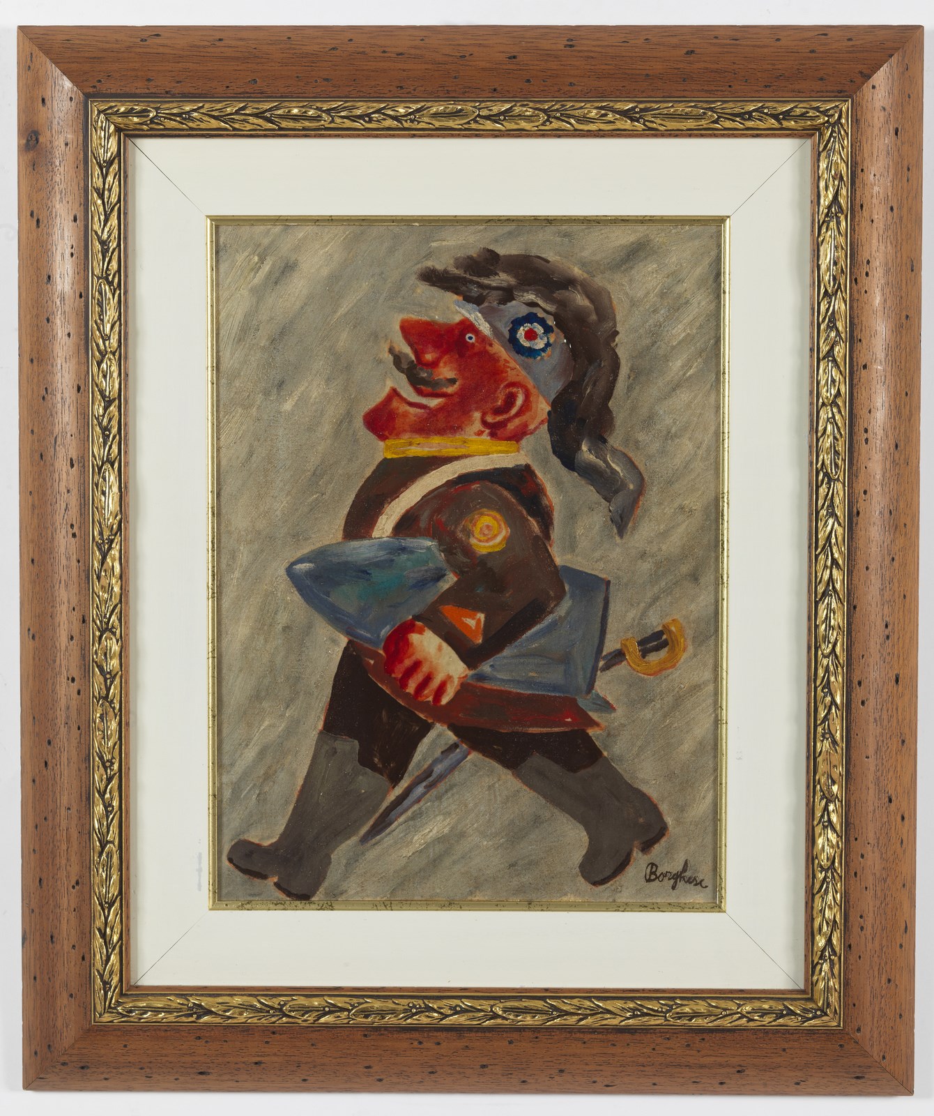 BORGHESE FRANZ (1941 - 2005) Generale con missile. Olio su tela . Cm 30,00 x 40,00. Firma in basso a destra. Autentica dell'artista su fotografia con dedica. Certificato di autenticità Galleria d'arte Internazionale Orler. Opera archiviata presso l'Archivio Franz Borghese - Galleria Artesanterasmo, Milano come da documentazione fotografica allegata all'opera riportante il relativo numero d'inventario. Cornice presente
