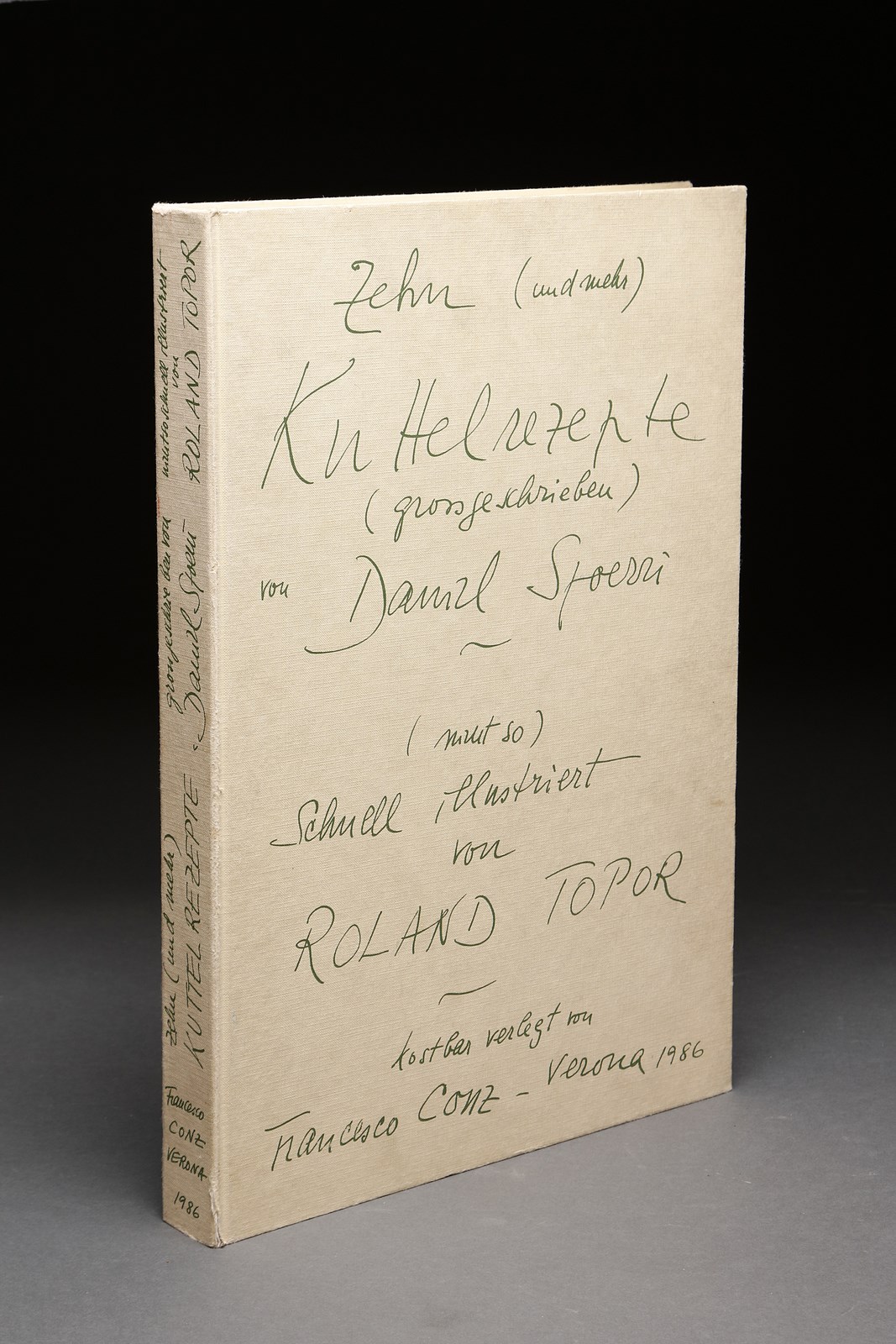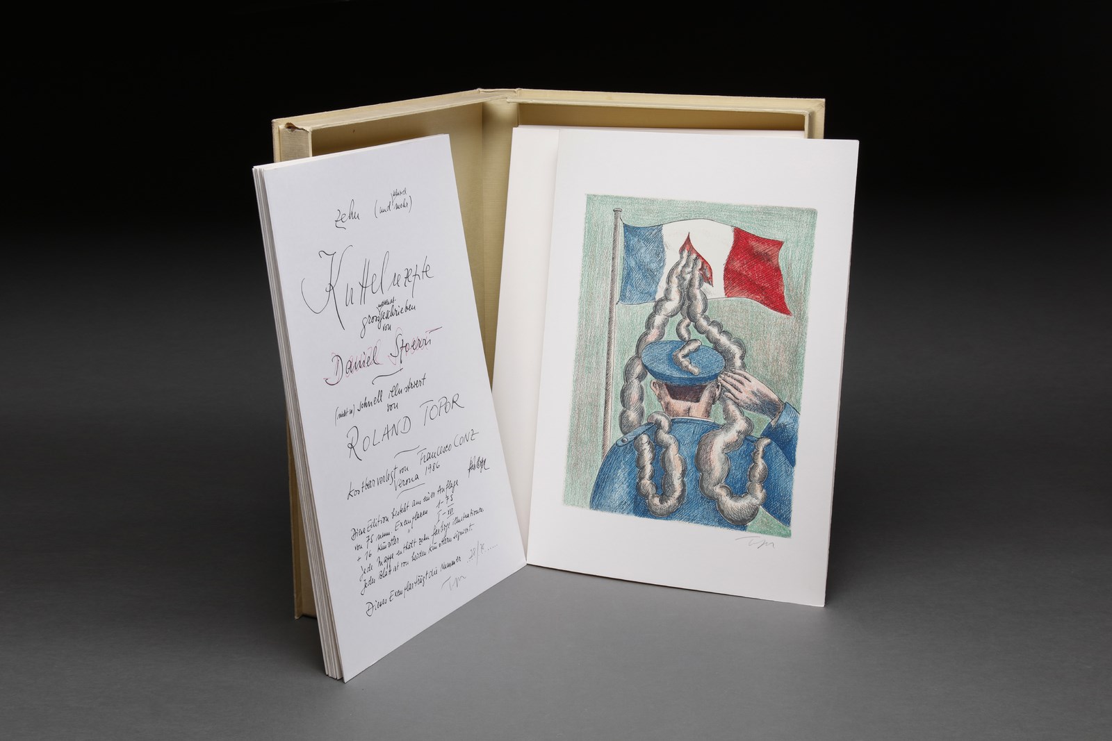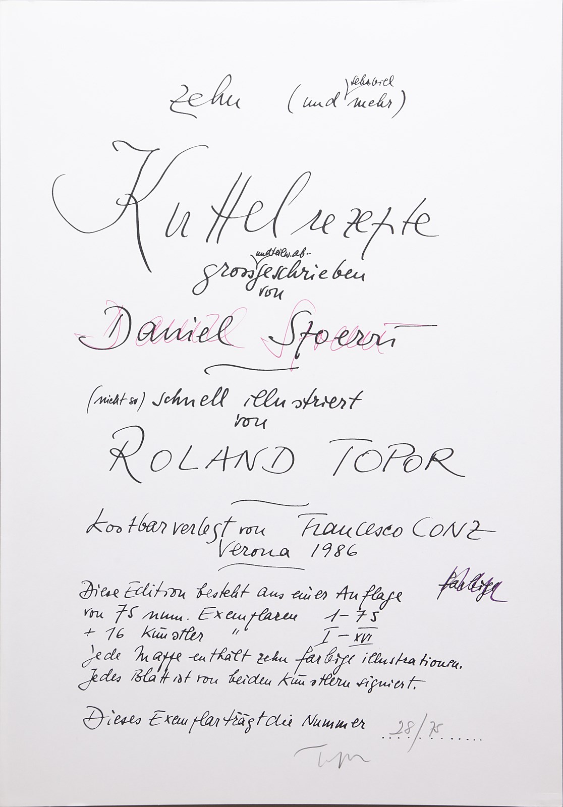 SPOERRI DANIEL (n. 1930) Cartella completa dalla REZEPT BIBLIOTHEK 1984-1990. Libro d'arte. Cm 47,50 x 33,00. 28/75. Ogni foglio presenta la firma di Topor in basso a matita. Firma a matita di Daniel Spoerri all'interno della copertina. Il lotto è uno dei dieci libri d'artista di ricette raccolte, trascritte e annotati da Daniel Spoerri, ognuno dedicato a un ingrediente specifico. Editore Francesco Conz e Daniel Spoerri. Portafogli illustrati da Attersee, Blume, Hofkunst, Luginbuehl, Schroer, Schwegler, Topor , Duwen, Gerstners e Roth. Edizione totale: 75 Esemplari numerati da 1/75 a 75/75; 16 esemplari numerati da I/XVI a XVI/XVI. Presente copertina originale.