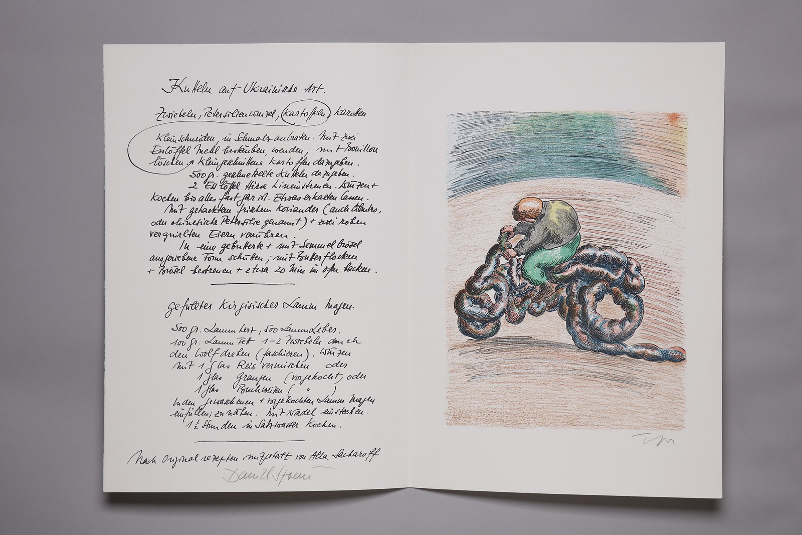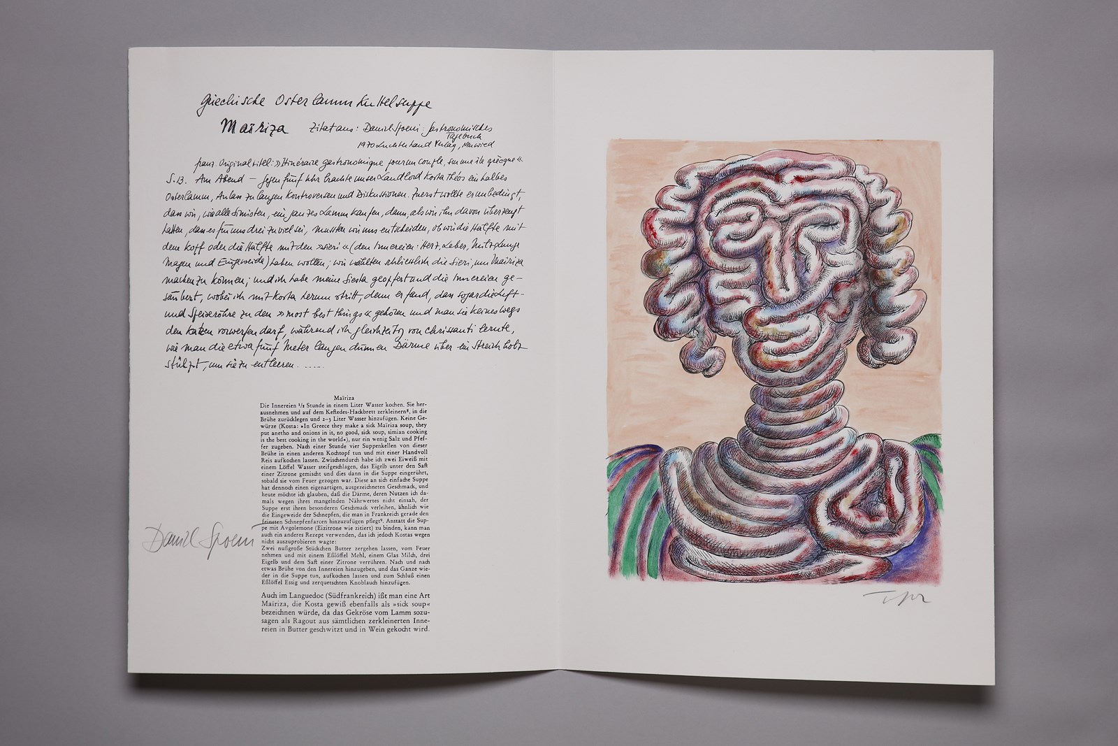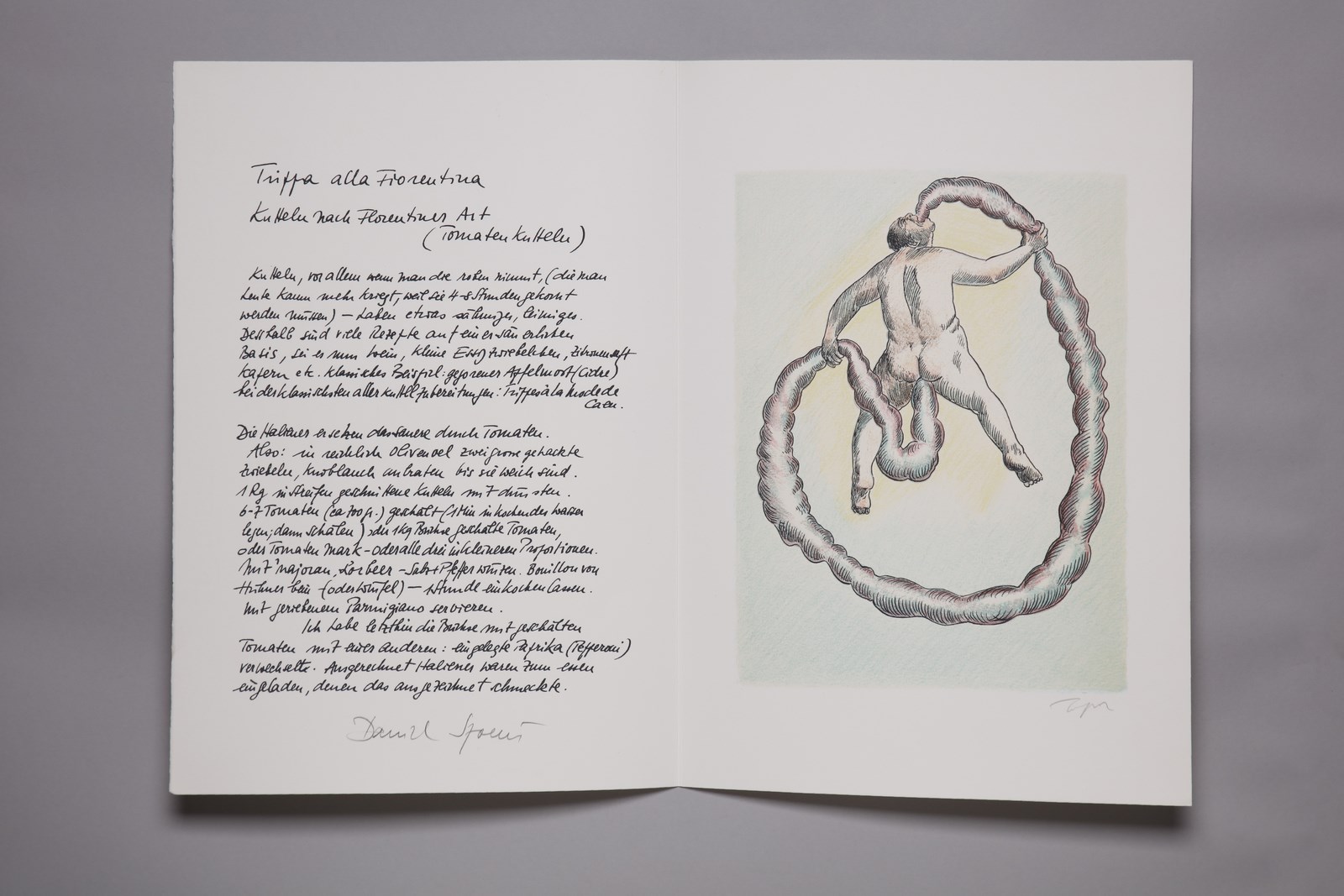SPOERRI DANIEL (n. 1930) Cartella completa dalla REZEPT BIBLIOTHEK 1984-1990. Libro d'arte. Cm 47,50 x 33,00. 28/75. Ogni foglio presenta la firma di Topor in basso a matita. Firma a matita di Daniel Spoerri all'interno della copertina. Il lotto è uno dei dieci libri d'artista di ricette raccolte, trascritte e annotati da Daniel Spoerri, ognuno dedicato a un ingrediente specifico. Editore Francesco Conz e Daniel Spoerri. Portafogli illustrati da Attersee, Blume, Hofkunst, Luginbuehl, Schroer, Schwegler, Topor , Duwen, Gerstners e Roth. Edizione totale: 75 Esemplari numerati da 1/75 a 75/75; 16 esemplari numerati da I/XVI a XVI/XVI. Presente copertina originale.